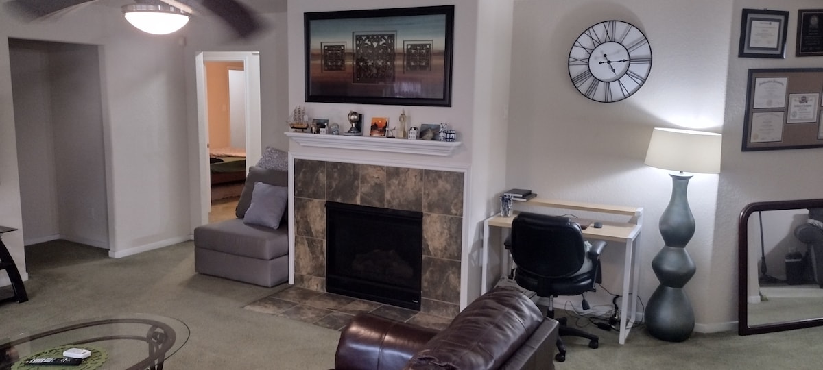 Your family will be close to everything when you stay at this centrally-located place that can sleep 2 adults. Completely non-smoking/vaping full bedroom with gueen size bed, walk in closet, includes stackable washer/dryer, comfortable living area with sleeper sofa, 3/4 bath with large shower, kitchen with microwave/convection oven, full refrigerator with ice maker and dishwasher. Wifi, 2 large Smart TVs and DVD player. Located in a quiet neighborhood with many trails for walking and running.