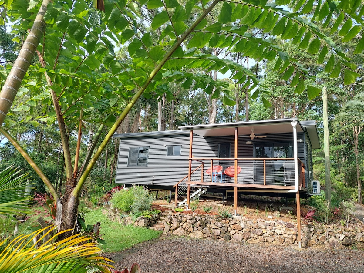 No TV, BYO Wifi. 20' basic container. Single trundle bed. Surrounded by native bush garden, on beautiful Land for Wildlife. It's small. It's unpretentious. There's a ceiling fan when the breeze is off duty. Enjoy the shower deck. Kitchen has sink, fridge, microwave, kettle, toaster and coffee pod thingamajig. You'll need a car: We're 7 min to the shops, 13 minutes to the river, 15 minutes to the surf, 25 min to the hinterland waterfalls but only 0 minutes to tranquility. Host on premises.