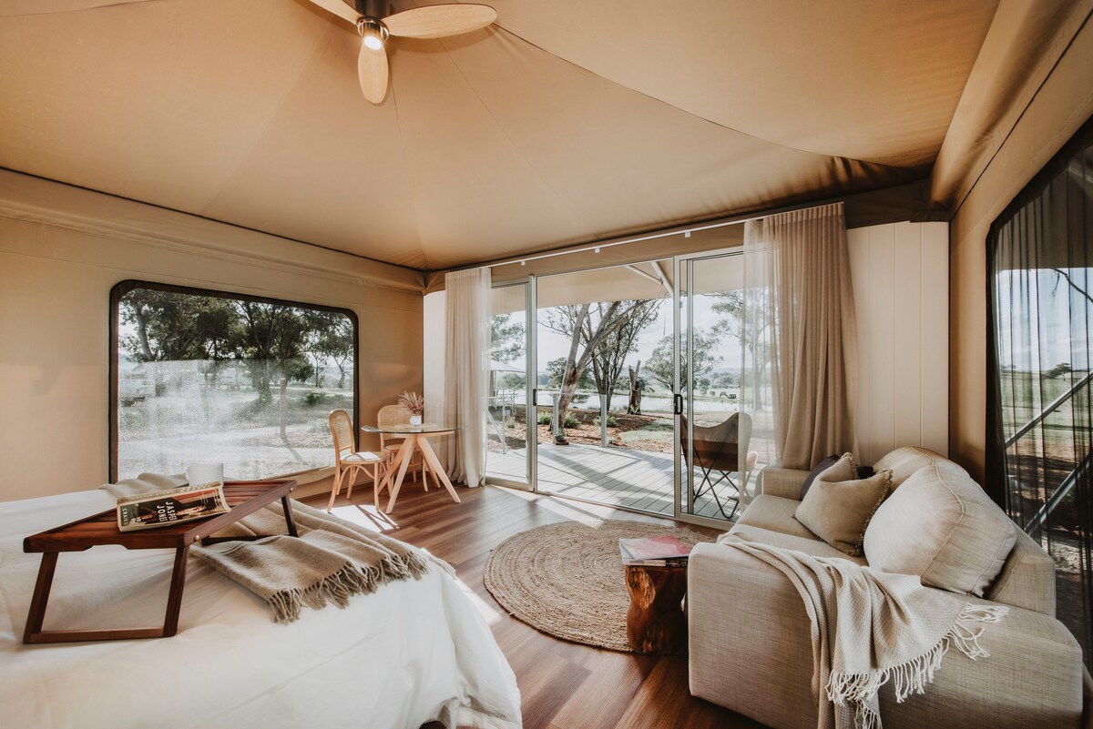Tận hưởng sự sang trọng tại Kangaroo Tent, Akuna Estate - lọt vào vòng chung kết Giải thưởng Du lịch NSW 2025. Nằm trên 254 mẫu đất bụi rậm của Úc, nơi nghỉ dưỡng thanh lịch này cung cấp bồn tắm ngoài trời riêng, lò sưởi và khu vực ăn uống dưới bầu trời sao. Thưởng thức bữa sáng miễn phí mà bạn chọn, rượu vang địa phương với pho mát và bánh quy trong khi được bao quanh bởi nội thất tinh tế, hoang dã thanh tĩnh và bầu không khí lãng mạn và thư giãn tuyệt vời.