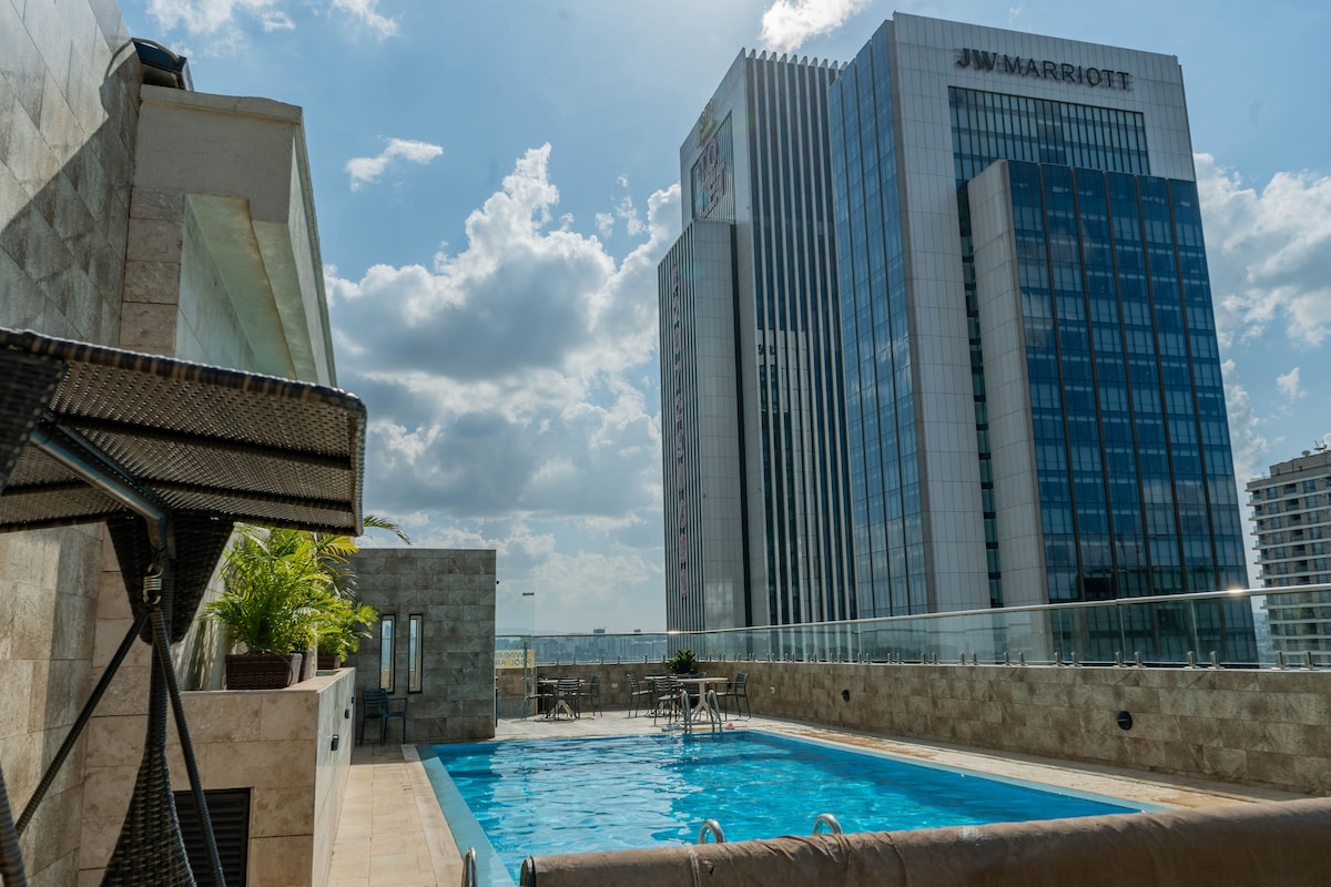 Thư giãn tại khu nghỉ dưỡng 1 giường độc đáo và yên bình này. Đây là một căn hộ 1 giường hoàn toàn mới;sạch sẽ với giường cỡ queen. Nó được trang bị vòi sen nước nóng tuyệt vời, ghế sofa hiện đại thoải mái và internet tốc độ cao. Bạn sẽ tìm thấy một nhà bếp được trang bị đầy đủ tiện nghi, khái niệm tối giản và tầm nhìn tuyệt vời ra thành phố. Nó có máy phát điện dự phòng đầy đủ, hồ bơi nước nóng, phòng tập thể dục hiện đại và khu vui chơi trẻ em. Vị trí cũng tuyệt vời với phương tiện di chuyển không hối hả.