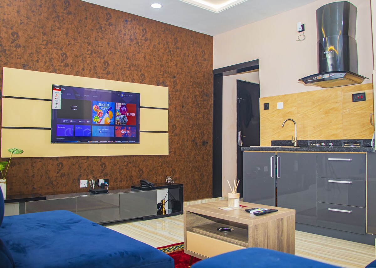 Căn hộ một phòng ngủ, phòng tắm và phòng khách với sự pha trộn giữa thiết kế gỗ đương đại Afrocentric và hiện đại. Spa trong nhà - phòng xông hơi khô, phòng xông hơi khô và phòng mát-xa -, nhà hàng trong nhà, phòng tập thể dục và phòng cà phê, hồ bơi ngoài trời với Pergola bên hồ bơi, điện 24/7, an ninh và cctv. Đó là lý tưởng cho cả thời gian ở dài và ngắn với tối thiểu ba ngày nằm cách sân bay quốc tế năm phút lái xe và cách sân bay nội địa mười hai phút lái xe. Có thể đón và trả tại sân bay