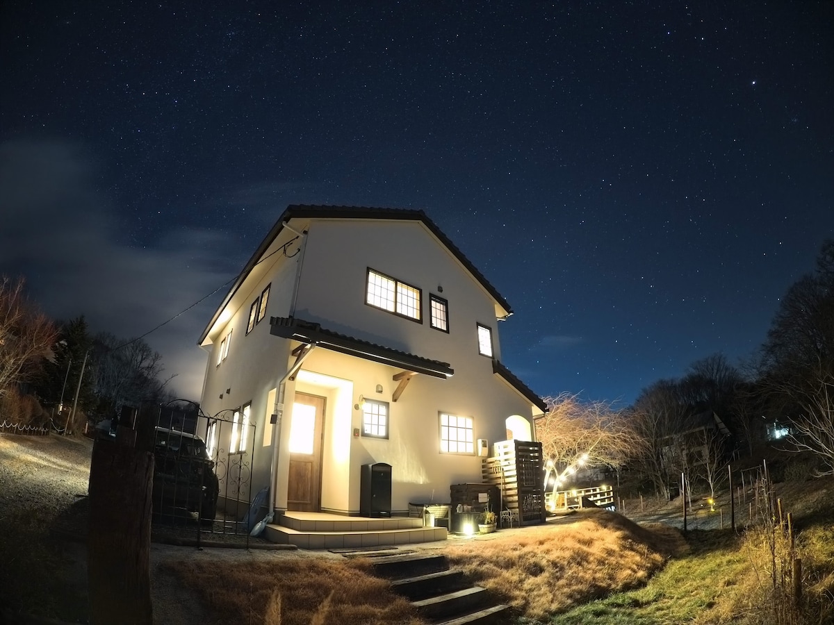 Chúng tôi đã mở một ngôi nhà được cải tạo làm nhà khách trong một khu biệt thự trên cao nguyên, cách nút giao thông Iida khoảng 10 phút lái xe. Nó không sang trọng, nhưng đã được cải tạo với trọng tâm là tạo ra một không gian thoải mái. An toàn ngay cả vào mùa đông.Tận hưởng thời gian với bạn bè trong một căn phòng ấm cúng. Bạn có thể ở trong một môi trường yên tĩnh cách xa các khu dân cư mà không phải lo lắng về việc mọi người theo dõi. Đây là một vị trí yên tĩnh, nơi bạn có thể nhìn thấy bầu trời đầy sao ngay bên cạnh đài quan sát, khu cắm trại ven hồ liền kề hoặc khu vườn mà bạn có thể đi bộ vào ban đêm. (* Không thể leo lên tầng quan sát trong mùa tuyết) Trong nhà, bạn cũng có thể thưởng thức rạp hát tại nhà với máy chiếu dễ vận hành với Wi-Fi.Không có nhà riêng bên cạnh, vì vậy bạn có thể thưởng thức âm nhạc lớn bất cứ lúc nào. Hãy thoải mái sử dụng 84 ㎡ diện tích sử dụng trong thời gian ở đây. Bạn có thể sử dụng máy giặt và máy sấy miễn phí, vì vậy bạn nên sử dụng máy giặt và máy sấy dài hạn. Chúng tôi có các tiện nghi cho phép bạn tự nấu ăn, vì vậy bạn có thể tận hưởng thời gian lưu trú phù hợp với kế hoạch du lịch của mình. Trong mùa đông (tháng 1 đến giữa tháng 3), tuyết và băng có thể vẫn còn trên các con đường gần cơ sở.Khi bạn đến, vui lòng đi xe ô tô có lốp không đinh và, nếu có thể, là xe 4WD.