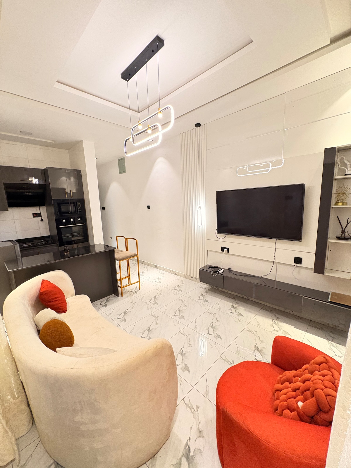 -New and fresh -24 hours power supply -Gym -PS5, unlimited and fast Wifi, Amazon prime, Netflix and dstv -House Keeping -Secured and serene estate -Clean water -spacious balcony -very close proximity to Leisure sports Park(basketball, football, long tennis and paintball) No get together or parties allowed( 2 guests max)