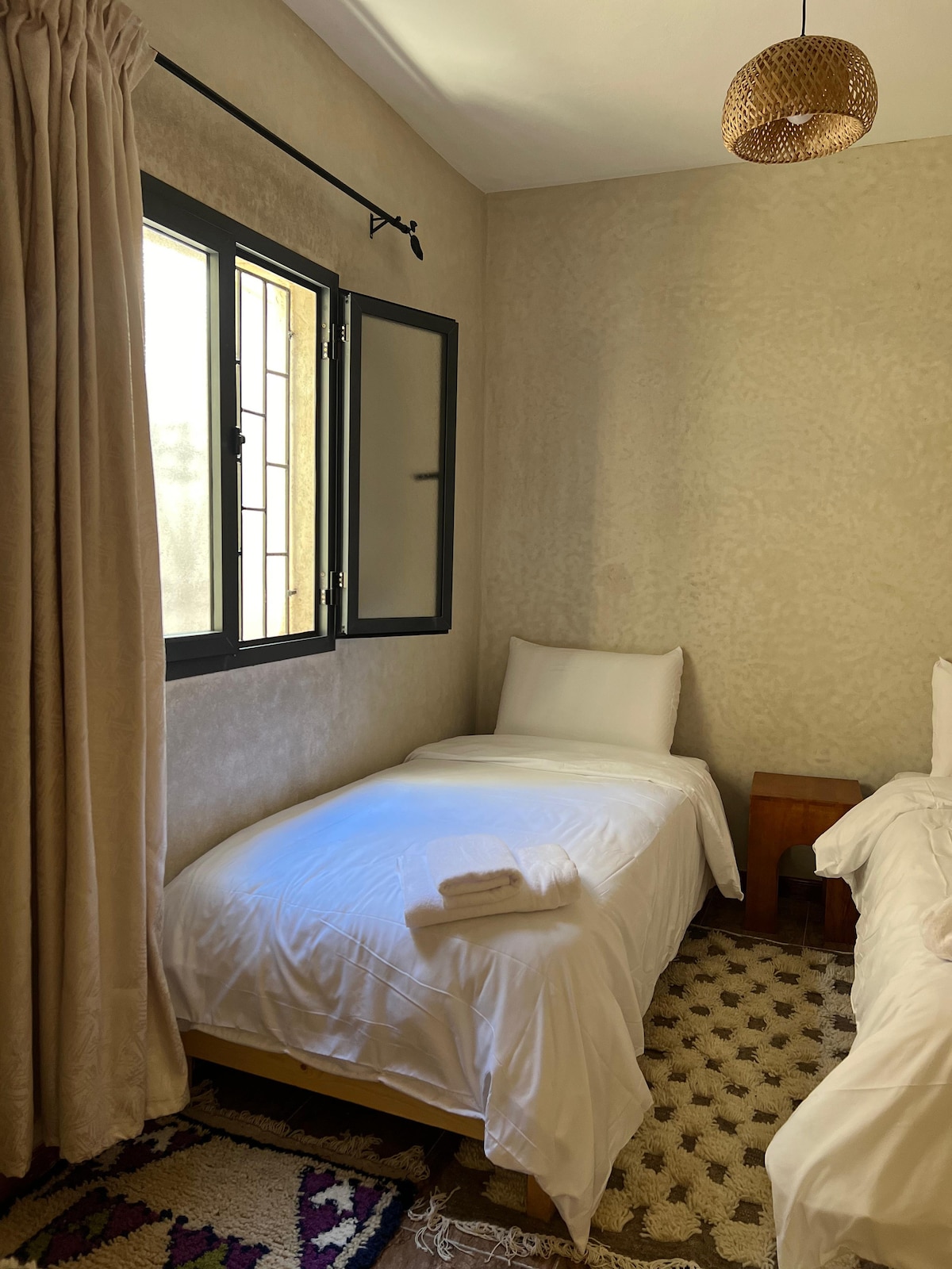 Cozy twin room inspired by the traditional charm of Fez, offering a peaceful and bright space to relax after a surf day. Located on the second floor of Nomazigh Surf House, guests can enjoy access to the chill terrace, co-working area and a rooftop with ocean view. Just a short walk to local bakery (1 min), Happy Tamraght restaurant (2 min), and Manzili Co-working (4 min). Close to popular surf spots like Devil’s Rock and Banana Point.