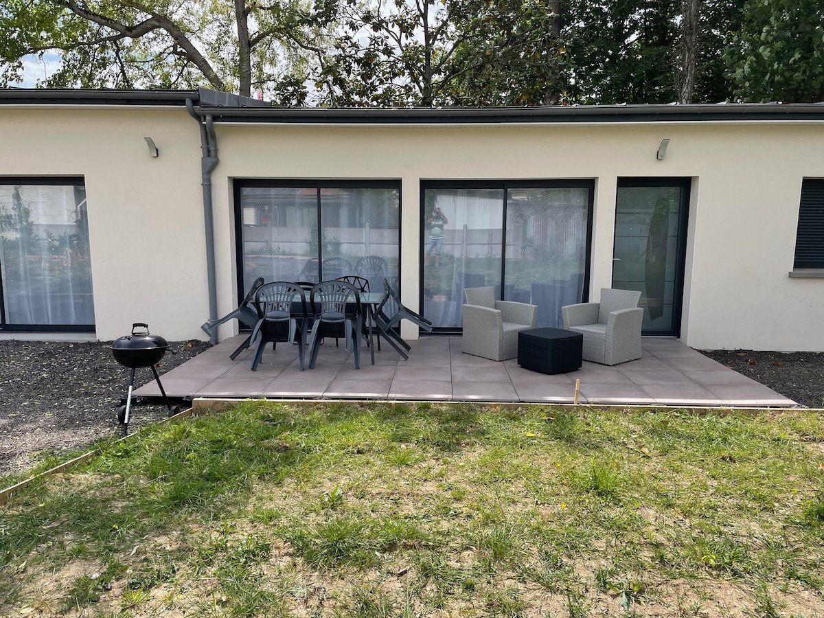 Notre gîte est séparée de notre demeure par un joli jardin paysagé . Entièrement refait à neuf , nous avons eu à cœur de le meubler avec goût et faisons en sorte que nos hôtes se sentent comme chez eux et ne manquent de rien durant leur séjour . Les amateurs de vélo pourront arriver chez nous via la voie verte qui passe derrière la maison et garer leurs vélos chez nous à l'abri .