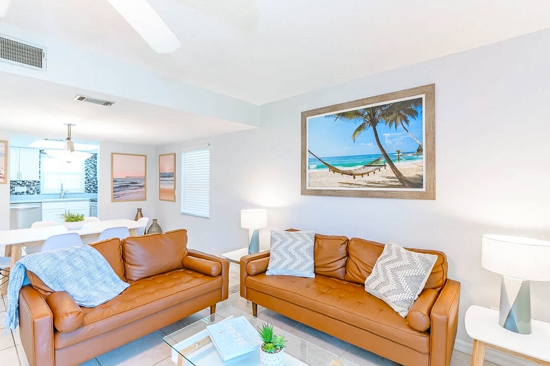This top-floor condo is just 102 yards from the beach line in the heart of Indialantic. Newly Remodelled w CB2, RH. Surrounded by restaurants and shops, it offers ample space and amenities for every taste: whether it's a romantic getaway, a fun-filled family vacation, a reunion with old friends, or just some much-needed 'me time. Fully equipped with beach gear, kitchen essentials, toiletries, and TVs in each room. Additionally, guests can enjoy the saltwater pool, beautifully lit and open 24/7