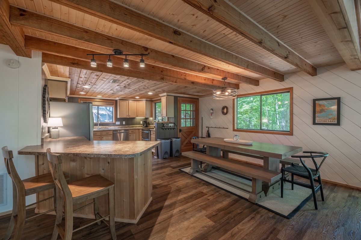 Nằm trong khu rừng nhìn ra Hồ Foxfire, ngôi nhà khung chữ A này mang đến một kỳ nghỉ bốn mùa hoàn hảo. Khi tuyết rơi, nó biến thành một kỳ nghỉ mùa đông tuyệt vời. Ấm cúng bên cạnh lò sưởi bằng đá, nơi tầm nhìn ra hồ được đóng khung bởi những cây phủ sương. Khi thời tiết ấm lên, hồ gọi! Tận hưởng lối đi thẳng đến Hồ Foxfire từ bến tàu riêng của chúng tôi. Hãy dành thời gian để câu cá, bơi lội hoặc đơn giản là phơi mình dưới ánh nắng. Nhà gỗ này sẽ giúp bạn tìm thấy niềm vui và thư giãn, bất kể mùa nào.