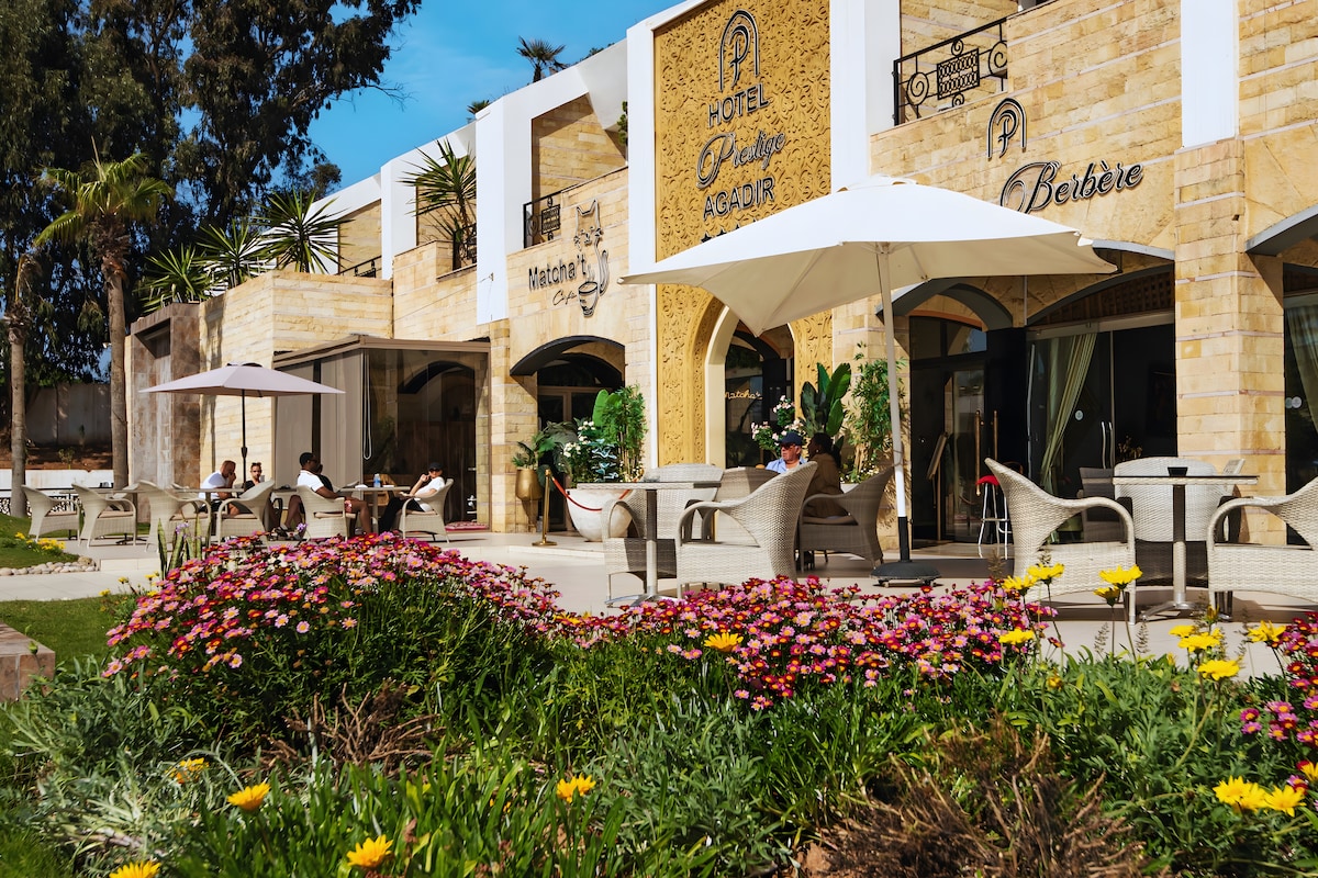 Découvrez l'élégance au cœur d'Agadir. L'Hôtel Prestige allie design marocain moderne et confort haut de gamme pour une expérience unique. Nos suites spacieuses, baignées de lumière, sont pensées pour votre sérénité. Profitez de notre piscine, de notre spa raffiné et d'un service attentionné. Idéalement situé pour explorer la ville ou pour vos rendez-vous d'affaires, le Prestige est l'adresse chic où l'hospitalité authentique rencontre le luxe urbain. Votre escale d'exception vous attend.