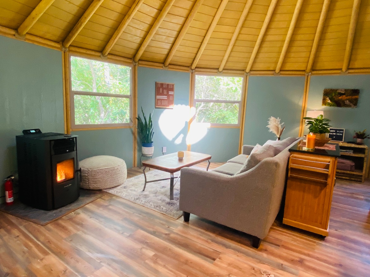 This yurt cabin is your perfect getaway! Tucked away in the woods with 110 acres out your back door, you are invited to unwind and enjoy nature. This space is bathed in natural light, streaming through the big windows and 5 ft ceiling dome. Enjoy the visual rhythm of the ceiling and the unique aesthetic of a round yurt cabin that is unlike anything you've experienced!