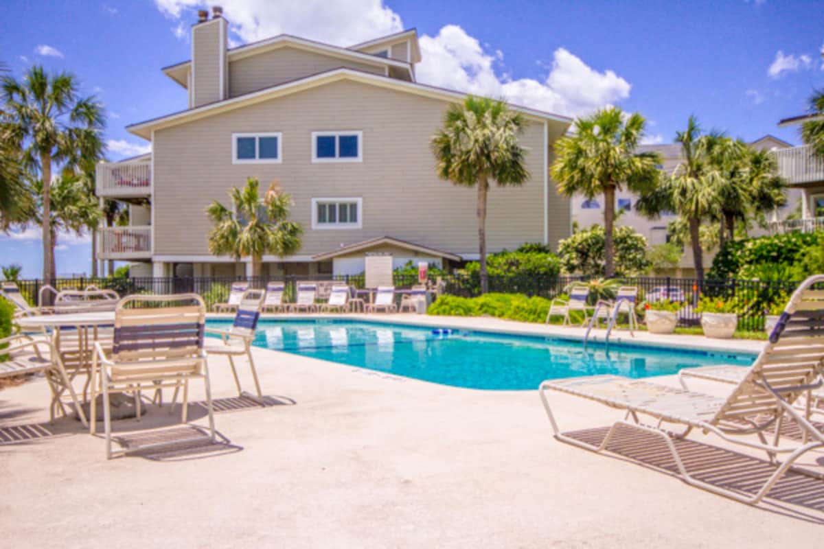 ROOF AND BUILDING MAINTENANCE ONGOING. THERE MAY BE WORKERS AND VEHICLES WEEKDAYS 7:30 AM - 6PM and SAT 9AM - 4PM. Beautiful, 1 B/1B unit with stunning views of the ocean and IOP beach. Enjoy your piece of paradise in this oceanfront unit with direct access to the beach, private pier, and pool. Relax with stunning views from the living room and balcony, just steps from the beach. Sleeps 5 (up to 4 adults & 1 child) with 1 Q bed, 1 Q sofa bed, and 1 hallway bunk.
