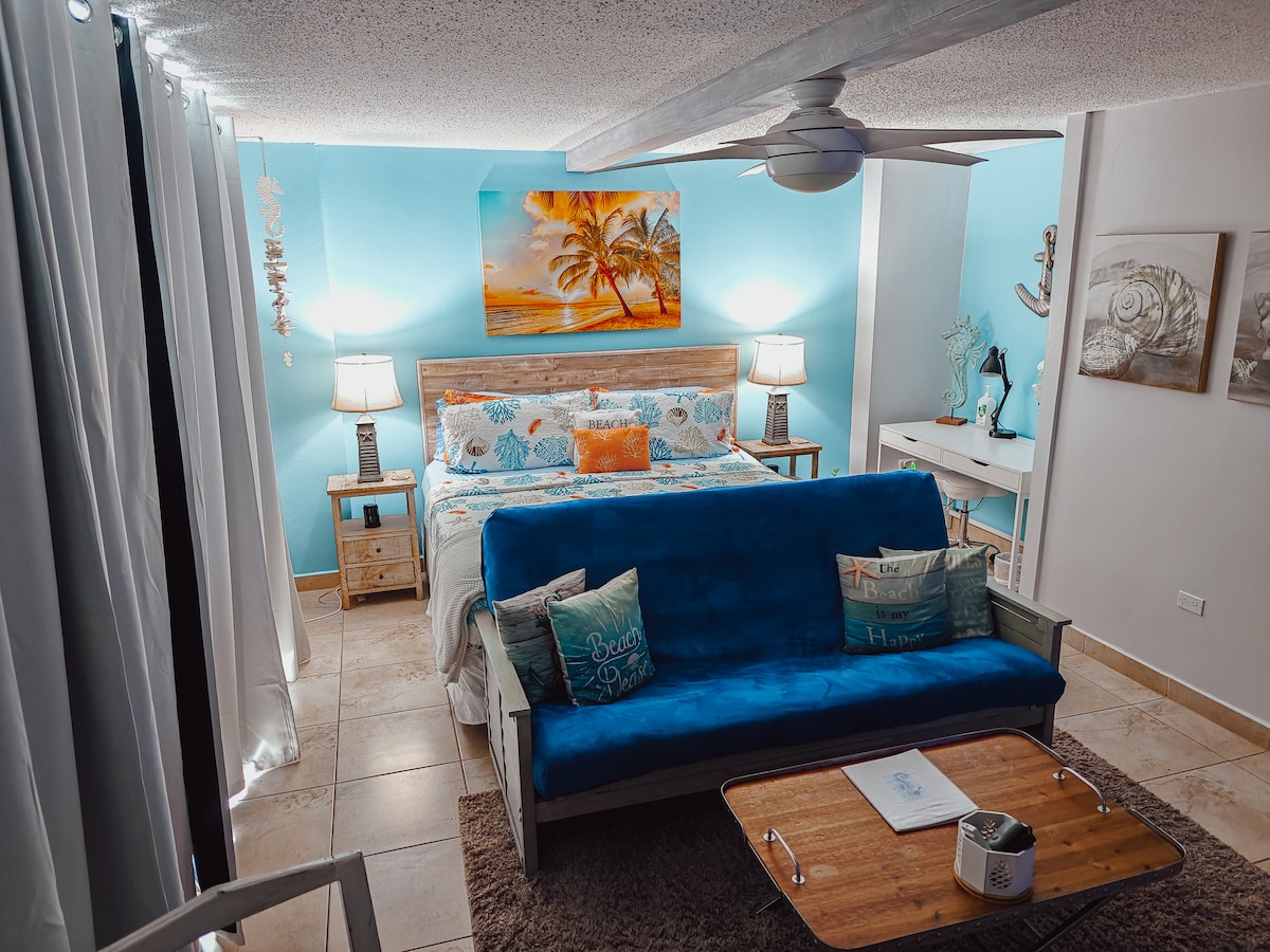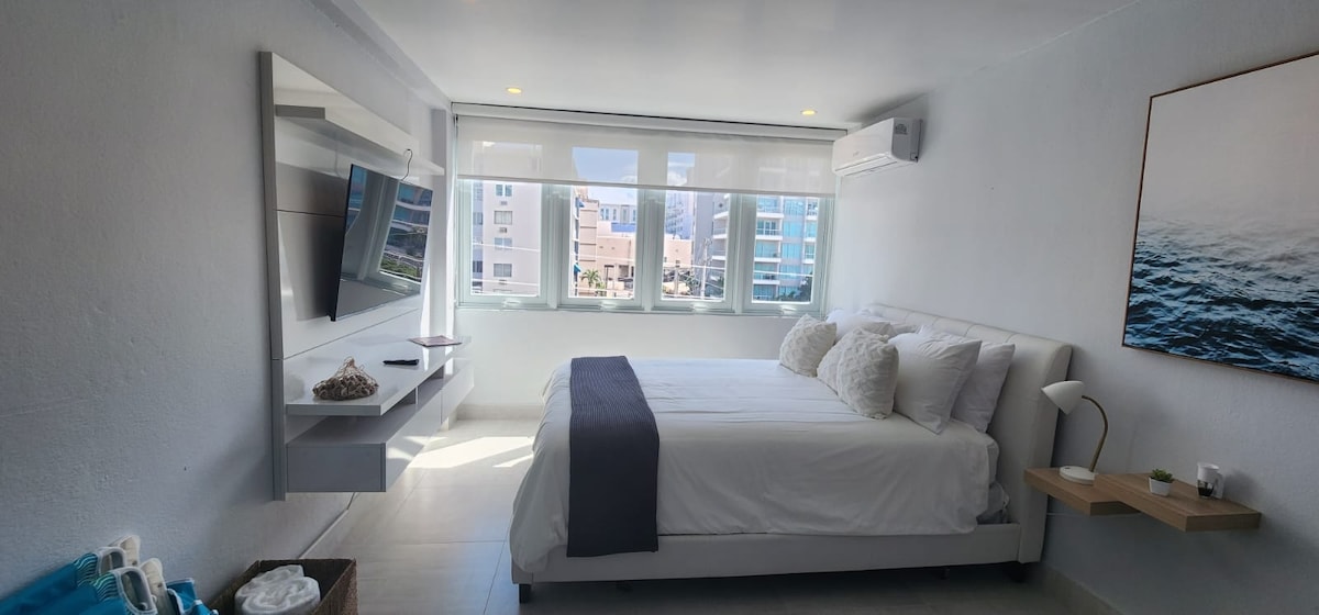 If you’re planning on staying on one of the most beautiful beach in the greater San Juan area, you’ve found the right place! Located on one of PR’s best strips, you’ll have turquoise waters on one side & on the other side, a 2mile strip to explore. Just take the elevator down! No hidden fees. 5 min from airport, 10 min or less to Old SJ, cruise ports, downtown SJ, Santurce, Condado, etc and 45 min drive to El Yunque. Free parking, air conditioning, hot water, beach equipment, SmartTV, Wi-FI.