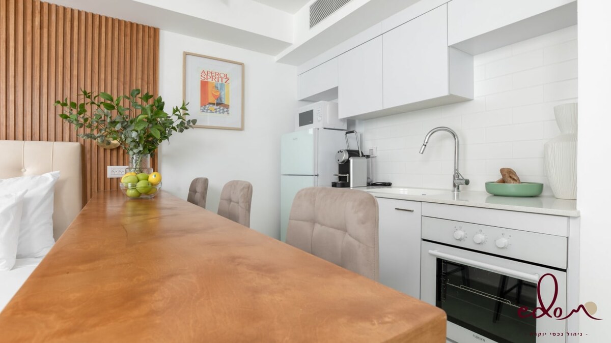 Nhà nghỉ dưỡng cho thuê sáng sủa và được thiết kế cho một cặp vợ chồng/kỳ nghỉ gia đình, nằm ngay trung tâm thành phố Eilat, cách biển và các trung tâm giải trí và mua sắm 10 phút đi bộ. Căn hộ có một phòng ngủ, ban công hướng ra biển đỏ, khu vực ăn uống trong nhà bếp và phòng khách. Bếp được trang bị lò nướng, lò vi sóng, bếp điện, máy pha cà phê và tủ lạnh. Có truy cập miễn phí vào Internet Wi-Fi và TV thông minh. Chỗ ở bao gồm khăn tắm, ga trải giường và điều hòa nhiệt độ trong nhà. Khoảng cách đi bộ từ căn hộ đến ga trung tâm khoảng 50 mét, 3 phút đi bộ đến siêu thị, nhà hàng, quán cà phê .