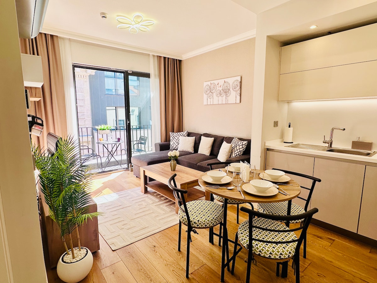 Enjoy a comfortable stay in our modern 65 m² residence within walking distance of Taksim Square. Cozy bedroom, bright living room, and fully equipped kitchen. Experience the comfort of a home with hotel-quality convenience and cleanliness. Located in a secure building with 24/7 security and elevator access, ideal for families, couples, and business travelers. Transport, restaurants, and shops are nearby, yet the area is peaceful and safe.