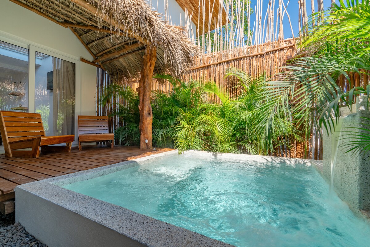Escape to a romantic loft with a private pool, surrounded by nature and just 20 m from the sea. Located in Playa Hermosa, Jacó, within the National Wildlife Refuge, it’s the perfect place to relax and reconnect. Unwind in the private pool with hydromassage and enjoy the sunset accompanied by the sound of the ocean. With prior reservation, you can access yoga classes, a sauna (additional cost), and a refreshing cold plunge.