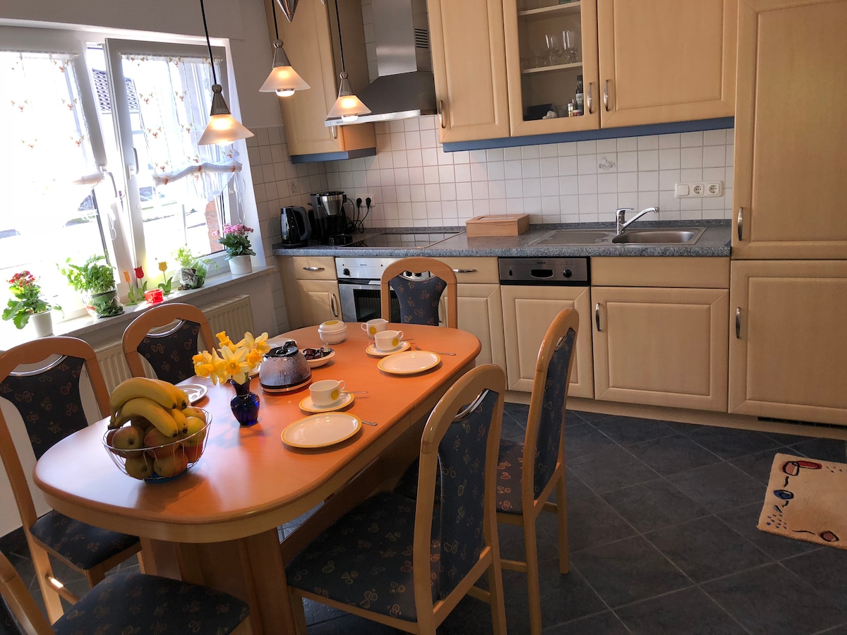 Die geräumige gut ausgestattete Einliegerwohnung befindet sich fünf Gehminuten vom Vareler Hafen entfernt. Die Wohnung verfügt über zwei Zimmer (ein großes Wohnzimmer und ein Schlafzimmer), ein Bad mit Dusche und Badewanne, eine Küche und einen direkten Zugang zum Garten. Ich wohne mit meinem Mann direkt nebenan .