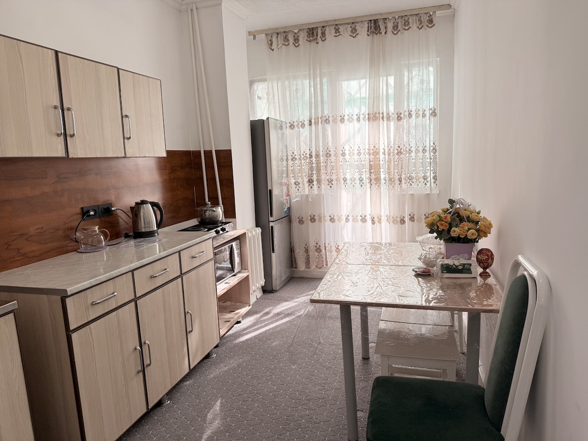 Căn hộ ấm cúng gần trung tâm thành phố. Căn hộ có mọi thứ để có thời gian lưu trú thoải mái, làm việc và nấu ăn. Bên cạnh điểm dừng goBus từ Bishkek. Thuận tiện nếu bạn đến bằng xe buýt. Các siêu thị và quán cà phê (Dastorkon) nằm trong khoảng cách đi bộ. Đây là căn hộ một phòng ở tầng hai với nhà bếp và vòi sen riêng biệt. Tôi sẽ vui lòng trả lời tất cả các câu hỏi và trợ giúp nếu bạn cần biết điều gì đó về thành phố. Dành cho những người muốn chơi cờ bàn và sách. Bạn có thể hút thuốc trên ban công.