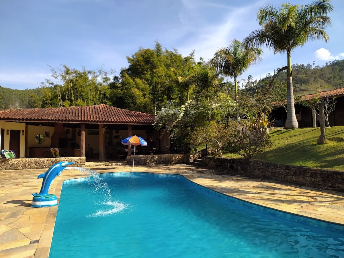 Sítio retirado da cidade com vista para montanha e muita natureza ao redor. Lugar perfeito para descansar e contemplar o pôr do sol. Possui rio com cachoeira dentro da propriedade acessada por trilha. Piscina grande, churrasqueira e mesa de bilhar. Estacionamento com 4 vagas cobertas. Na casa, a água é aquecida com chuveiros elétricos e a cozinha é bem equipada (além do fogão a gás, há um fogão a lenha. A lenha é vendida a parte, R$35,00. Wifi por radio. velocidade 30Mb.