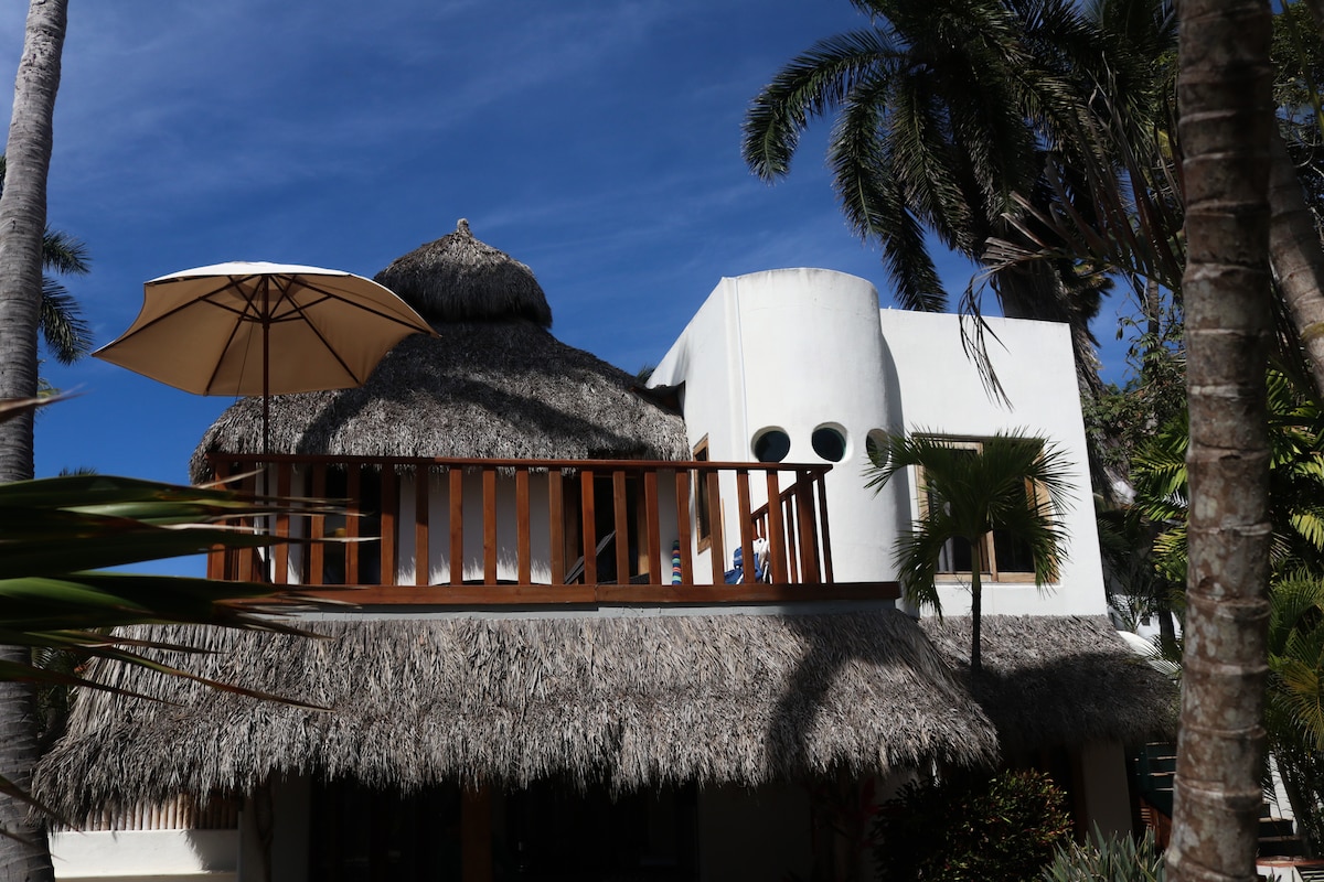 Căn gác PALAPA NGOÀI TRỜI MỘC MẠC; tầm nhìn tuyệt vời; Không có điều hòa hoặc màn hình; rừng nhiệt đới. 2 phút đi bộ đến bãi biển rộng yên tĩnh. Ghế/ô bãi biển, Wifi, người giúp việc, két an toàn, bể ngâm bể sục chung, camera an ninh, LR, quầy bar, bếp nhỏ, bồn tắm/vòi sen, tầng trên thứ 2, mèo thường trú. Phòng ngủ Queen. Lưới chống muỗi, quạt, gió biển, bình xịt côn trùng. 6 phút đi bộ trên bãi biển hoặc đường phố đến nhà hàng. Nếu nhạy cảm với côn trùng, hãy xem xét Calabaza's Africa Suite với điều hòa nhiệt độ, màn hình và cửa ra vào.