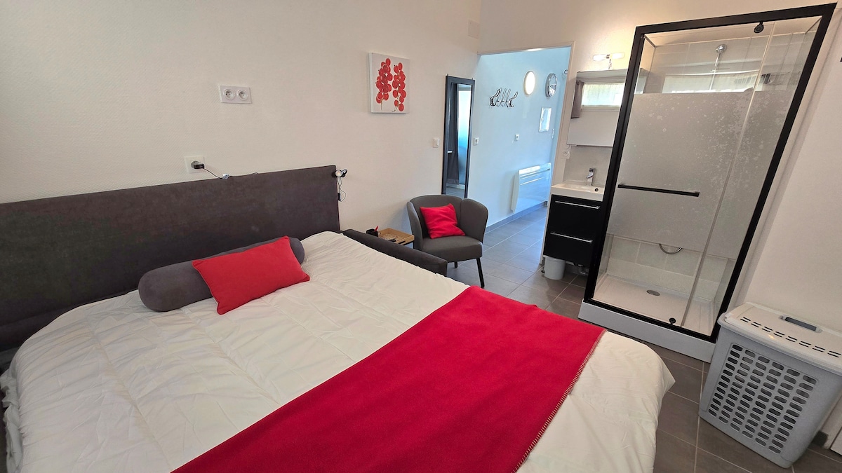 Khám phá một thiên đường ấm cúng, hoàn hảo cho gia đình hoặc các chuyến công tác. - Vườn và bãi đậu xe riêng miễn phí - Lộ trình đi bộ hoặc đi xe đạp - Điều hòa nhiệt độ, bộ đồ giường chất lượng khách sạn, buồng tắm đứng - Nhà bếp đầy đủ tiện nghi, Wi-Fi, khăn trải giường và khăn tắm được cung cấp Một căn hộ ấm cúng, nơi mỗi khoảnh khắc đều mời gọi bạn thư giãn và tận hưởng sự yên tĩnh.