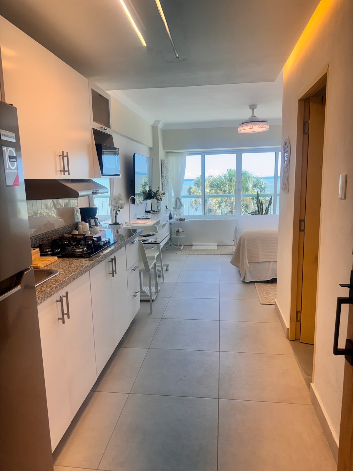 Khám phá studio sang trọng bên bờ biển này, với tầm nhìn toàn cảnh mà bạn có thể tận hưởng từ bất kỳ góc nào của không gian. Trải nghiệm sự riêng tư hoàn toàn, không có công trình xây dựng ở phía trước, chỉ có màu xanh vô tận của Biển Caribê. Cách Av vài phút George Washington, có lối đi nhanh đến các đường phố chính của Santo Domingo. Lý tưởng để nghỉ ngơi, ngắt kết nối, làm việc hoặc tận hưởng một kỳ nghỉ lãng mạn với sự thoải mái, thanh lịch và yên bình trước biển.