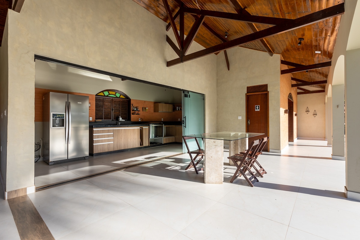 Esta casa de campo é perfeito, para festas confraternizações, estadias em família, casamentos, aniversários, contém quatro banheiros 4/4, cozinha ampla toda equipada Brastemp, piscina churrasqueira, área verde Lago onde você pode tentar pescar, tudo de mais confortável para uma boa estadia