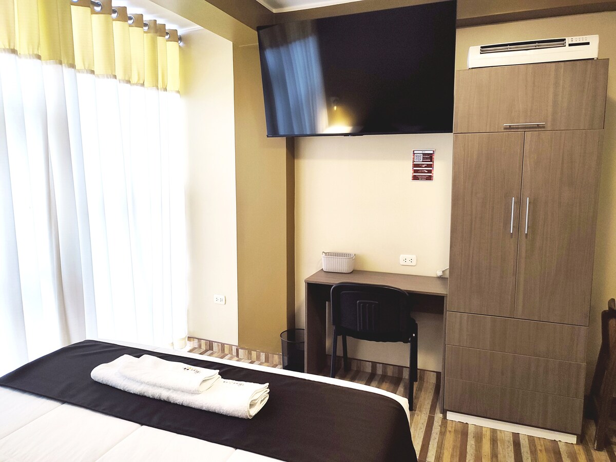 Nuestra habitación cuenta con mobiliario y una cama de excelente calidad. Una TV Smart de 55'', con calefacción,una bañera personal y agua caliente en el lavamanos y la ducha. El Wifi en esta categoría de habitación es la de mejor señal y estabilidad. Priorizamos la limpieza de las habitaciones y los espaciones comunes. También contamos con el servicio de desayuno, disponible por un pago adicional.