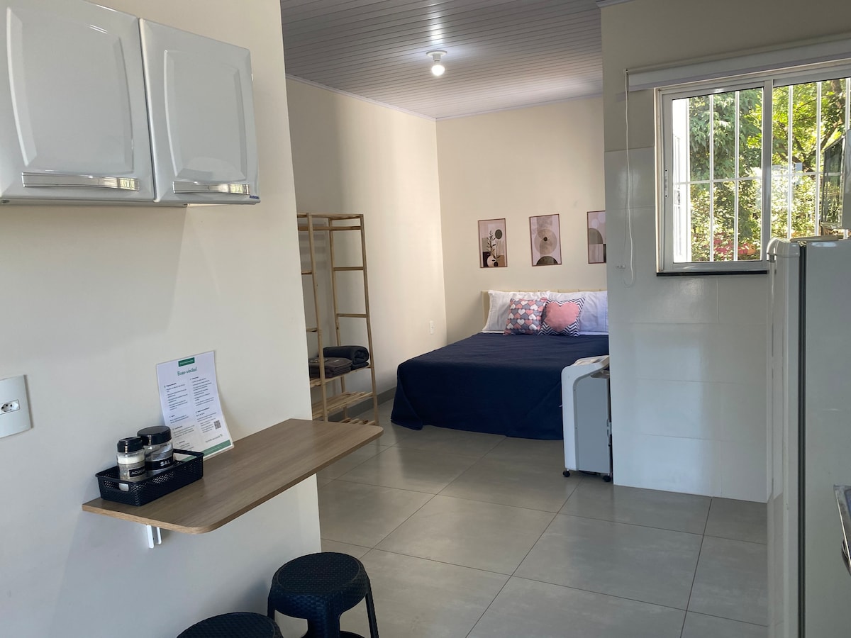 Sejam bem vindos! Imóvel simples e aconchegante, localizado em bairro residencial seguro e arborizado. Local ideal para quem busca tranquilidade, conexão com a natureza e principalmente privacidade. Sintam-se, em casa! Saliento que o ar condicionado da sala/cozinha não tem capacidade para refrigerar todo o ambiente, a função dele é somente para amenizar o calor. O do quarto sim, é para atender e refrigerar adequadamente o ambiente.