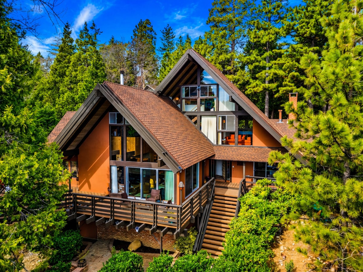 Cabin khung chữ A màu đen này nằm cao giữa những cây thông ở Running Springs, mang đến tầm nhìn yên bình trên ngọn cây từ các tầng trên cả ba tầng. Với thiết kế hiện đại giữa thế kỷ ấm áp, đây là nơi nghỉ ngơi lãng mạn hoàn hảo. Ẩn mình trong căn gác ấm cúng, thưởng thức đĩa than hoặc một bộ phim trong phòng chiếu phim bí mật và thư giãn cùng nhau trong phòng xông hơi thùng mới. Hoàn hảo cho các cặp đôi kỷ niệm ngày cưới, tuần trăng mật, những kỳ nghỉ đặc biệt hoặc đơn giản là tận hưởng thời gian yên tĩnh, ý nghĩa cùng nhau trong rừng.