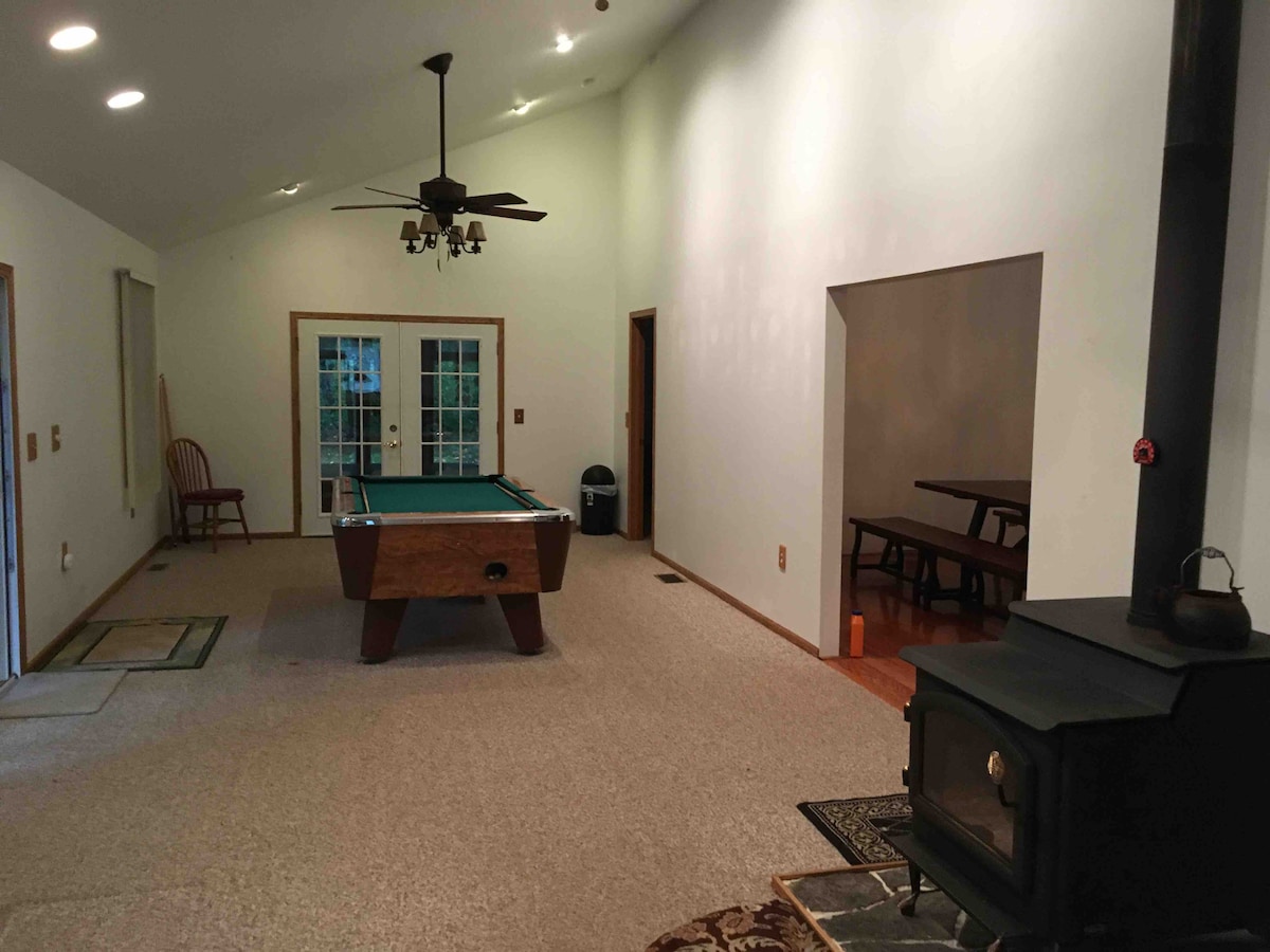 Ngôi nhà rộng rãi và thoải mái trên 5 mẫu Anh với đường mòn trong rừng, đi bộ đến Blue Lake, đường mòn ORV và nằm cạnh đất tiểu bang! 2200+ sq ft - Rất nhiều không gian mở để giải trí, hố lửa, bàn bi-a, đầu đốt củi, TV thông minh 65"với BLU Ray/DVD, Internet tốc độ cao và wifi. Phòng Jacuzzi 14x14 *thêm $ 39/đêm (phải yêu cầu và thanh toán trước) . Hoàn hảo để săn bắn, câu cá, trượt tuyết, quads, màu sắc mùa thu hoặc chỉ cách thành phố Traverse <1 giờ đi từ Traverse City và các điểm tham quan xung quanh! 21+để thuê lưu ý không có điều hòa nhiệt độ