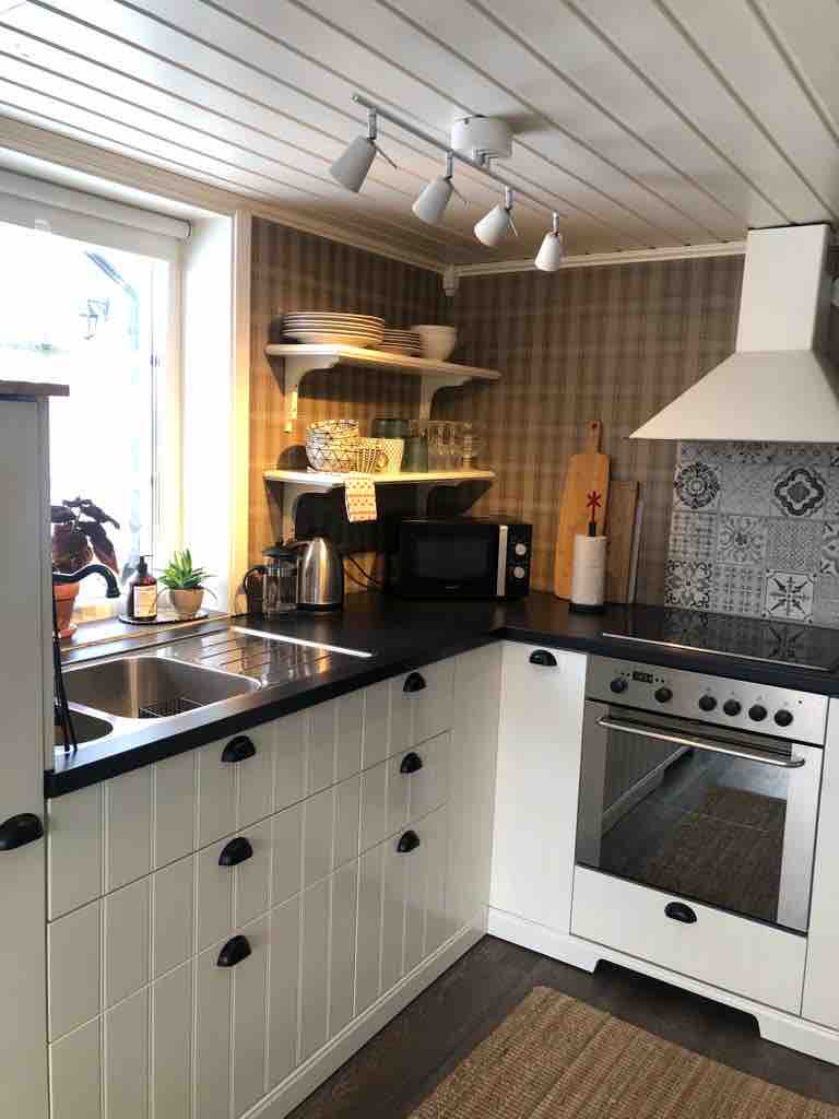 House (25 sqm). Private entrance, toilet, shower cabin & washing machine. The price includes bed linen, towels & final cleaning. One large room with a bed (140 cm), sofa (which can be used as a bed), desk. NO KITCHEN but there is a small refrigerator, micro & water boiler. As a hotel room - larger. Good storage and drying facilities. WIFI, TV with apple TV. Own part of patio. Not shoveled in winter. Parking space - by house. "Trixy" driveway up, due to road conditions.