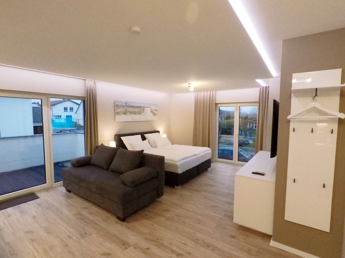 Căn hộ 1 phòng ngủ yên tĩnh với tầm nhìn toàn cảnh; Bếp riêng với bếp nhỏ, máy pha cà phê, máy nướng bánh mì, ấm đun nước, bát đĩa... Vòi sen / WC; Sân thượng có BBQ; Chỗ đỗ xe trong khuôn viên; có thể cung cấp kết nối điện cho xe điện (16A230V) với mức phí tối thiểu; Có thể dùng giường cũi du lịch cho em bé và/hoặc sofa giường bất cứ lúc nào. Vị trí: Căn hộ nằm trong khu dân cư dành cho gia đình, vị trí hướng Nam. Tiện nghi phù hợp cho người khuyết tật: Thật không may, căn hộ không có rào cản!