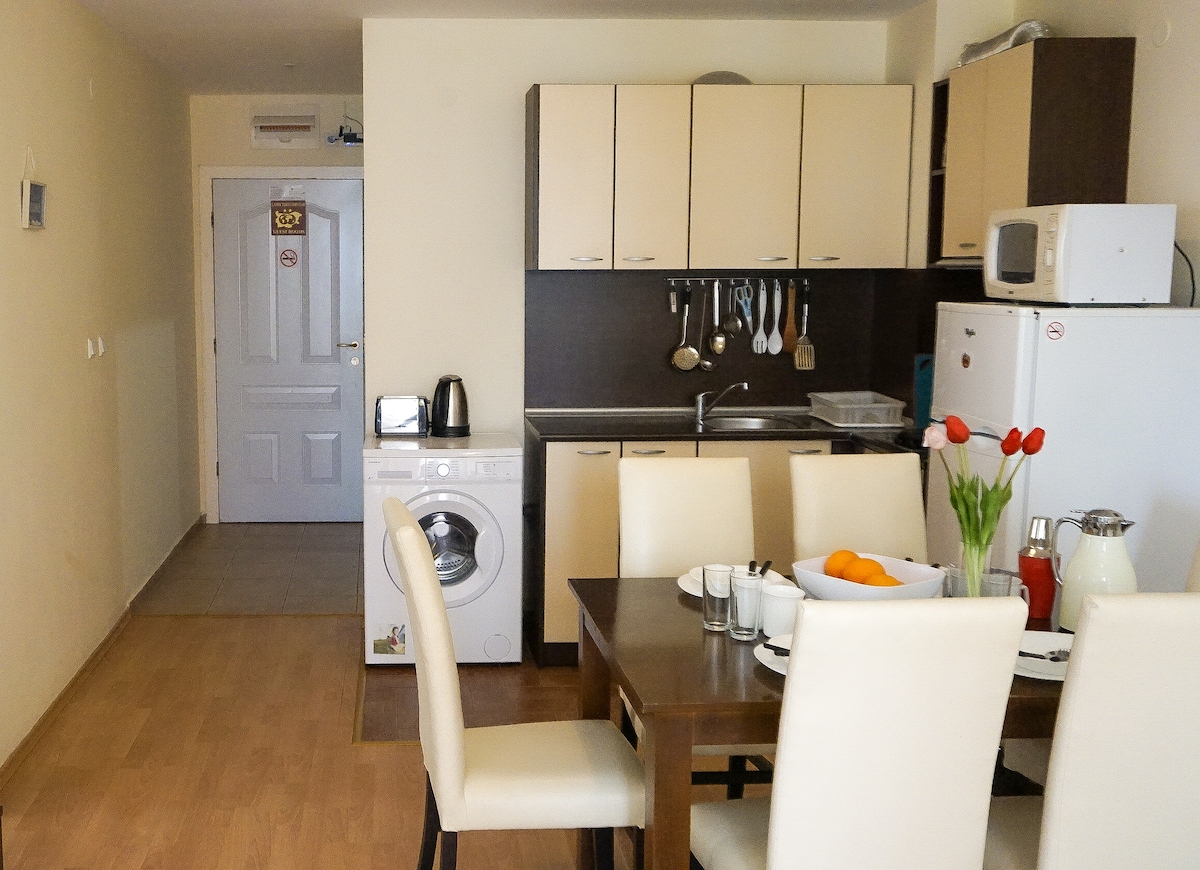 căn hộ nằm ở trung tâm lý tưởng của Nessebar. Gần với mọi thứ cần thiết 50 mét giao thông công cộng 50 mét 100 mét hiệu thuốc 50 mét cửa hàng tạp hóa 50 mét nhà hàng 200 mét từ lối vào bãi biển và cách Nessebar cũ một km. Căn hộ có hai phòng ngủ riêng biệt với nhà bếp giường đôi được trang bị lò nướng hai đĩa nóng thêm ấm đun nước nóng tủ lạnh lớn với nĩa tủ đông. Nếu cần thiết, hãy rửa bát. Chào mừng