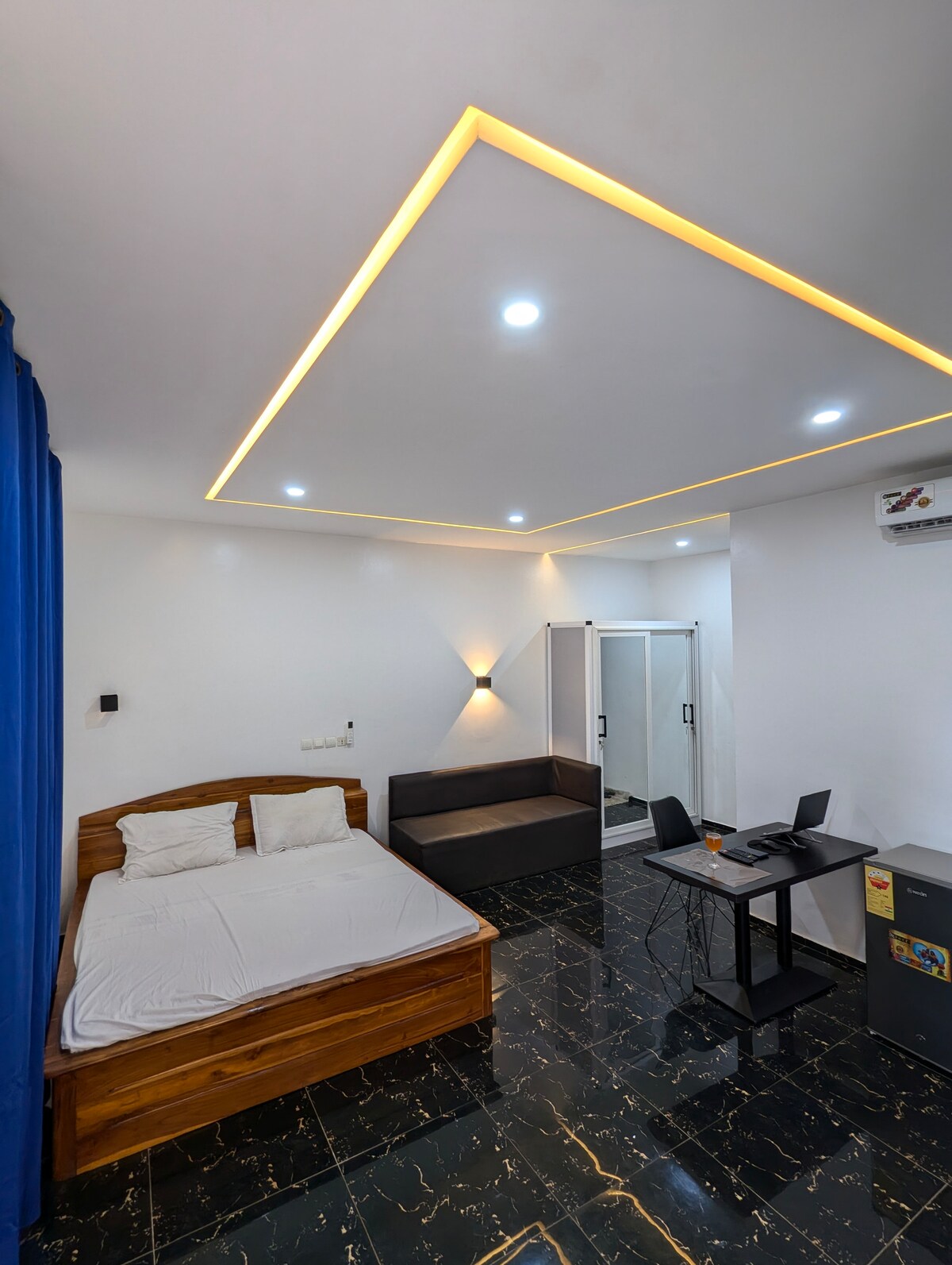 Ce logement chic située à Lama-Kpédah à 5 km du centre-ville de Kara vous offre un cadre de vie unique dans le confort, la modernité et la sérénité pour un séjour paisible et sécurisé. APPARTEMENT MEUBLÉ de 70 m2 Séjour Coin repas Télévision écran plat de 65'' connectée 01 lit de grande taille (190 x 210) 01 armoire à double battants 01 Cuisinière mixte (foyers à gaz fourni et plaques à induction) Des ustensiles de cuisine et couverts de haute gamme 01 frigidaire de 210 litres