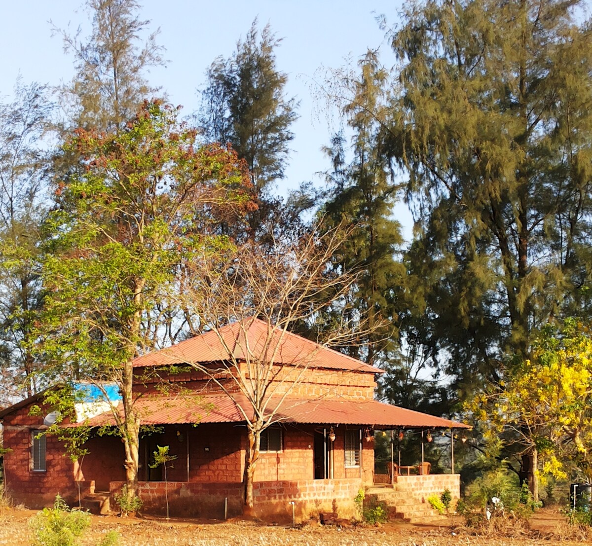 Clay construction with European technology provides natural cooling for all seasons. 24 hours power, water, wifi and our own farm makes us totally independent even in a pandemic. Viyoddha is surrounded by green fields, river canal and streams. Viyoddha has 5 private rooms for guests with private baths. Central sitting area connects all rooms. Proximity to the highway, mall & hotels gives additional support. We also provide home cooked veg and non veg foods for breakfast, lunch and dinner.