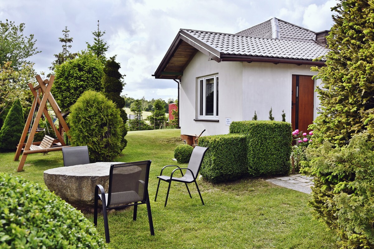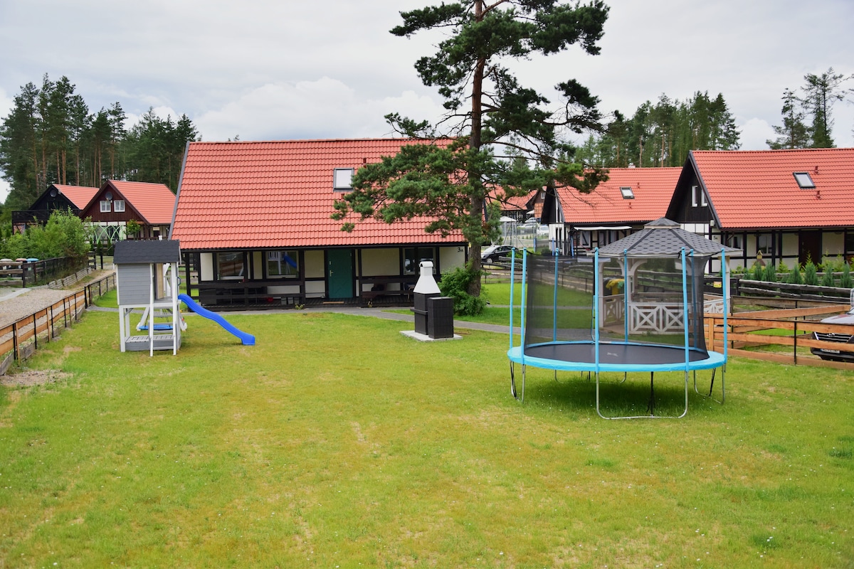 Nhà nghỉ thôn dã nằm trên một khu đất rộng 1000 m2 ở khu vực Kashubian cách Hồ Thánh vài phút đi bộ. Trên lô đất có một tấm bạt lò xo, một sân chơi, một bữa tiệc nướng với một nhà hút thuốc, một vọng lâu với một chiếc bàn tròn. Nhà nghỉ thôn dã có 4 phòng ngủ, một giường đôi ở tầng trệt, 3 ở tầng 1: 2 giường đôi và 1 giường 4 giường và 2 phòng tắm. Phòng khách có lò sưởi và bếp đầy đủ tiện nghi
