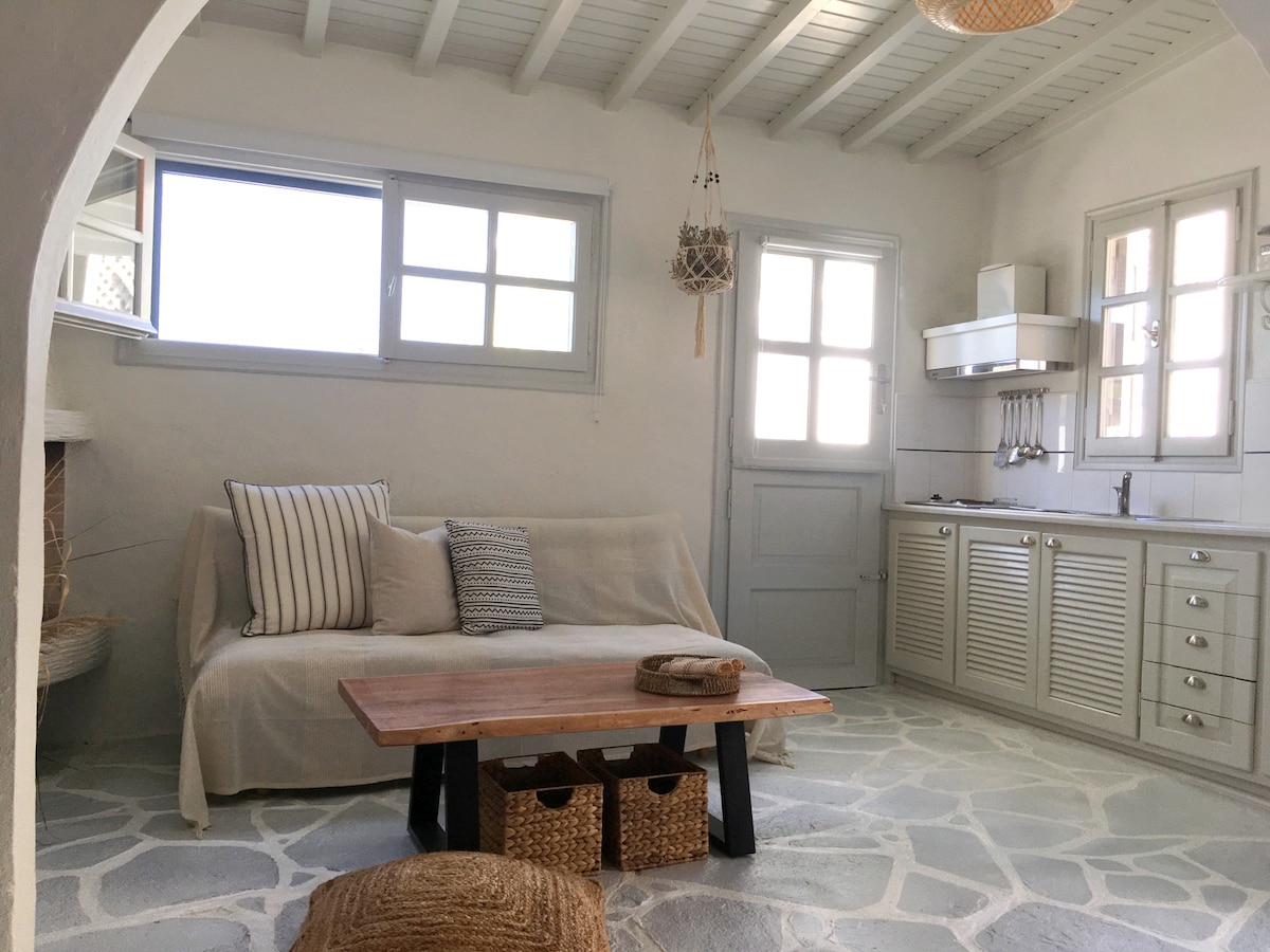 The house is located at Agios Romanos' beach. The beach can be accessed on foot. There is a tavern, a small cafe and a beach bar. The sofas and the KIng size bed are built-in. The most outstanding feature of the house is the unique view, which you can enjoy from every room and the balcony. After every accommodation, the house is sanitized with the use of a steam cleaner and detergents that contain chlorine. During your stay and if you wish to, the house is cleaned every 3 days, free of charge.