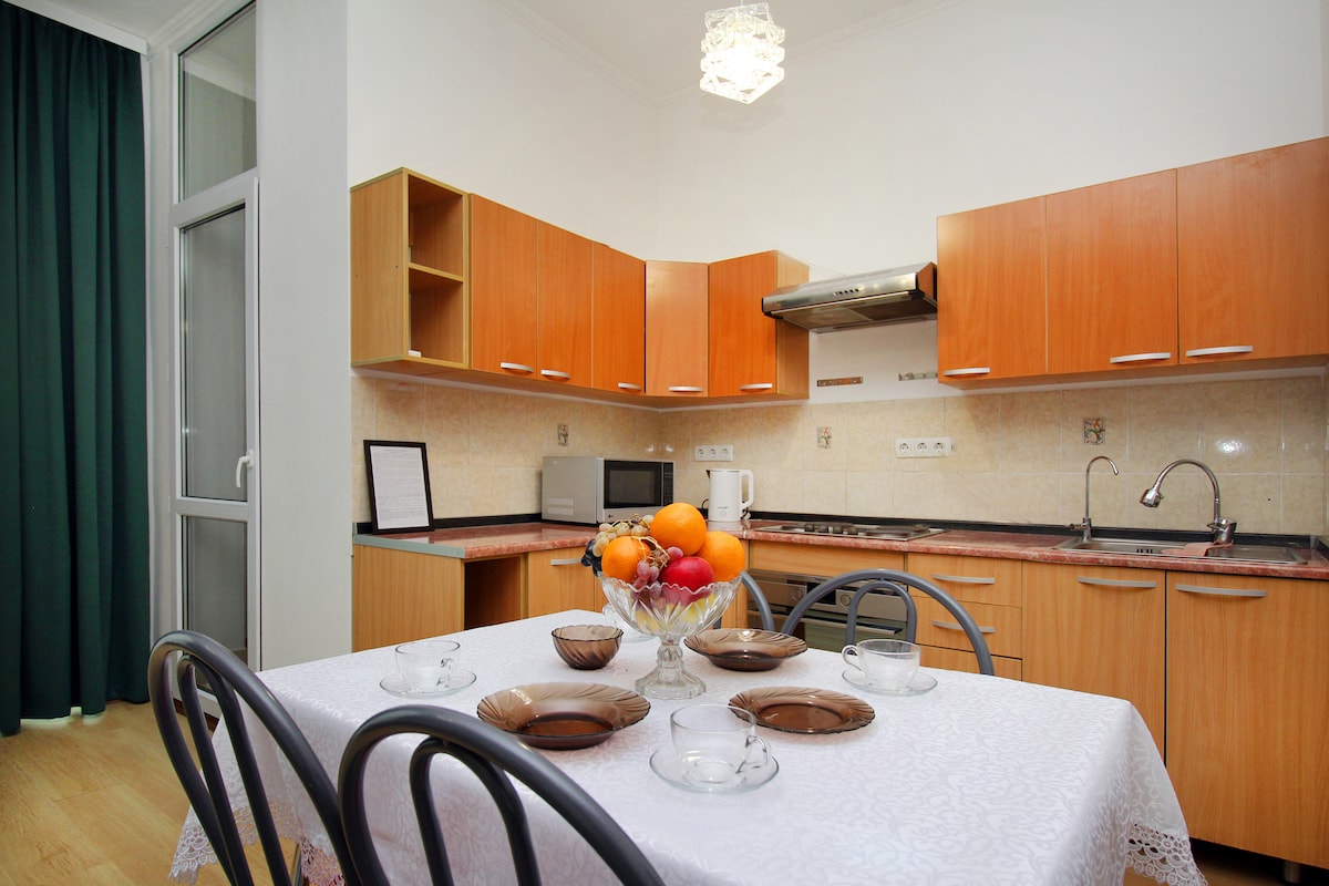 Căn hộ 2 phòng ngủ hiện đại cho tối đa 6 khách tại “Miracle is a Miracle and Warm Home”. Tầng trên cùng với 2 phòng tắm, điều hòa, Wi-Fi tốc độ cao và thang máy. Phòng ngủ 1 có một giường đôi, Phòng ngủ 2 có vách ngăn có thể đóng, ngoài ra còn có sofa giường trong studio. Nhà bếp và khu vực sinh hoạt đầy đủ tiện nghi. Chỉ 2–3 phút đi bộ đến ga tàu điện ngầm Baykonur, các quán cà phê, nhà hàng, Sân vận động Trung tâm và Khu liên hợp thể thao Olympic. Hoàn hảo cho các gia đình, nhóm hoặc khách đi công tác.