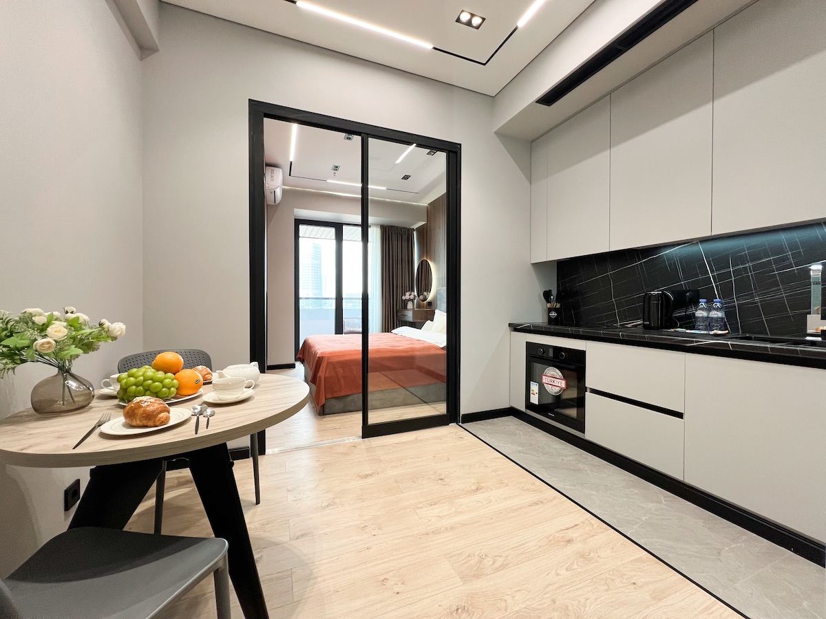 Уютные апартаменты расположены на 15 этаже современного жилого комплекса. Из окон и с балкона открывается красивый вид на город и район Tashkent City — особенно впечатляюще вечером, когда загораются огни столицы.