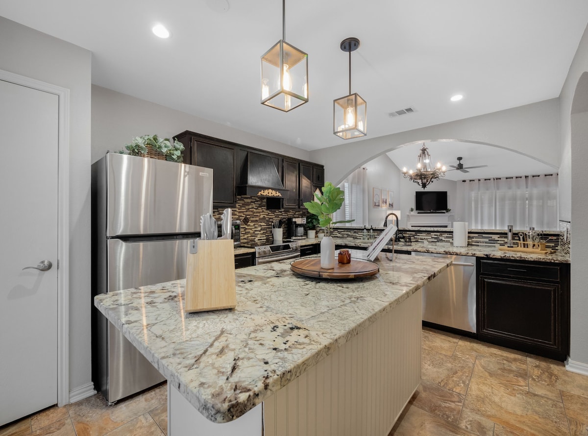 Chào mừng bạn đến với Casa Amigos - nơi nghỉ ngơi ấm cúng, mộc mạc hiện đại của bạn chỉ cách Downtown Fort Worth 20 phút! Ngôi nhà 3 phòng ngủ/2 phòng ngủ này có bố cục khái niệm mở, bếp đầy đủ tiện nghi và phòng chính thanh bình. Thư giãn trên sân hiên có mái che, nướng s'more bên hố lửa hoặc tận hưởng khu vườn có hàng rào yên bình. Nằm trong một khu phố yên tĩnh, phù hợp với gia đình với WiFi nhanh, TV thông minh và tất cả các tiện nghi trong nhà. Gần các địa điểm ăn uống, mua sắm và công viên địa phương - hoàn hảo cho kỳ nghỉ tiếp theo của bạn!