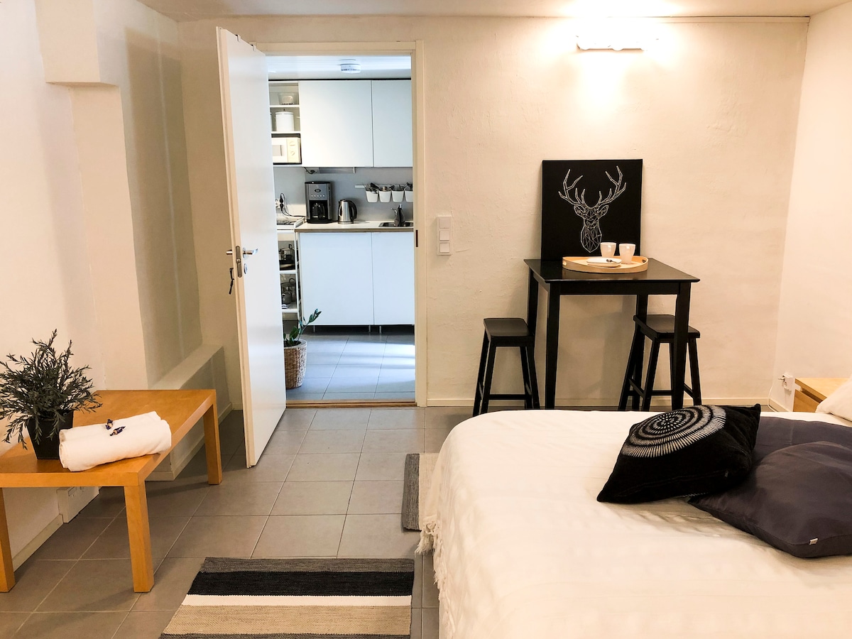 Skandinaavisella tyylillä laitettu huoneisto, omalla sisäänkäynnillä rintamamies taloni alakerrassa. Karjasilta on valittu Suomen parhaimmaksi asuinalueeksi, keskustaan ja juna-asemalle on n. 2 km. Keittiö: jääkaappi, mikro, induktioliesi, kahvinkeitin, airfryer, vedenkeitin ja astiasto. Pyyhe, vuodevaatteet ja kahvit/teet kuuluvat hintaan. Käytössä on 1 ilmainen polkupyörä kesäaikaan, autolle lämpöpistoke. Avain myös lukkokoodilla. Lämpimästi tervetuloa!