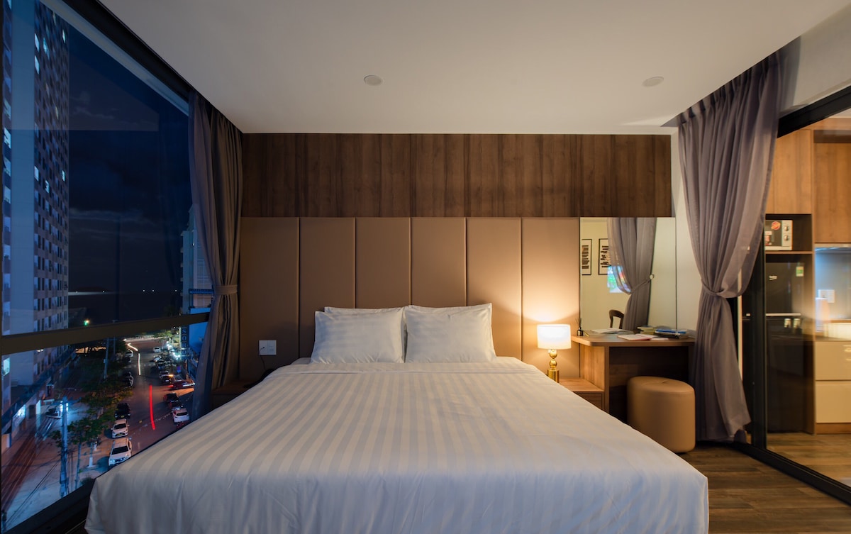 Studio trên tầng cao đầy phong cách này ở Panorama Nha Trang mang đến sự pha trộn hoàn hảo giữa sự thoải mái và tiện nghi hiện đại. Cửa sổ từ sàn đến trần khung nhìn ra thành phố ngay từ giường cỡ king của bạn với ga trải giường 5 sao cao cấp. Bố cục rộng rãi bao gồm bàn làm việc rộng rãi, TV thông minh 43inch và phòng tắm lớn, đầy đủ tiện nghi. Cho dù bạn đến đây để công tác hay giải trí, bạn sẽ tận hưởng một kỳ nghỉ thanh bình ngay trung tâm Nha Trang, chỉ cách bãi biển, ăn uống và giải trí vài bước chân.