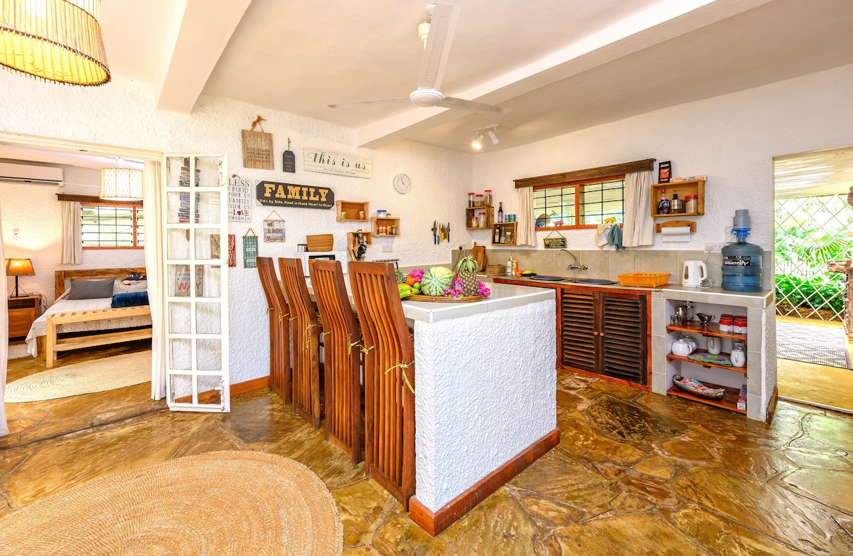 Tận hưởng một kỳ nghỉ yên tĩnh trong ngôi nhà nghỉ thôn dã ấm cúng này ở vùng nông thôn Chumani, Kilifi. Nó có một chiếc giường thủ công thoải mái, một hiên nhà và một phòng tắm bán mái mở cho ánh sáng và tia nắng mặt trời. Thư giãn trên hiên nhà, tắm nắng nhàn nhã trên võng hoặc tận hưởng không gian ngoài trời rộng lớn trong khu vườn xanh và mát mẻ tuyệt đẹp. Vườn ngoài trời và nhà hàng được dùng chung với 2 nhà nghỉ thôn dã khác. Giá đã bao gồm bữa sáng. Các bữa ăn khác được nấu trong bếp chung bởi chính bạn hoặc nhân viên của chúng tôi. Bãi biển cách 15 phút.