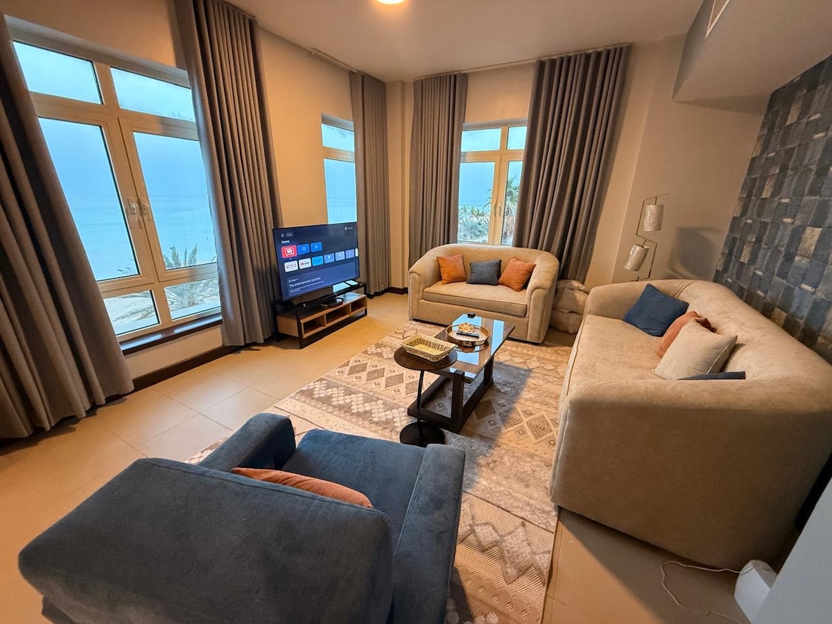 Căn hộ "Amwaj View" là một căn hộ ba phòng ngủ sang trọng có tầm nhìn ra biển tuyệt đẹp. Nằm phía trên một loạt các nhà hàng và quán cà phê cao cấp, cư dân có thể tận hưởng nhiều lựa chọn ăn uống và giải trí chỉ cách đó vài bước chân. Căn hộ cũng nhìn ra một hồ bơi đẹp, tạo ra một bầu không khí thanh bình và thư giãn. Thiết kế nội thất kết hợp sự thanh lịch và thoải mái, với các cửa sổ lớn cho phép ánh sáng tự nhiên tràn vào, mang đến tầm nhìn toàn cảnh biển
