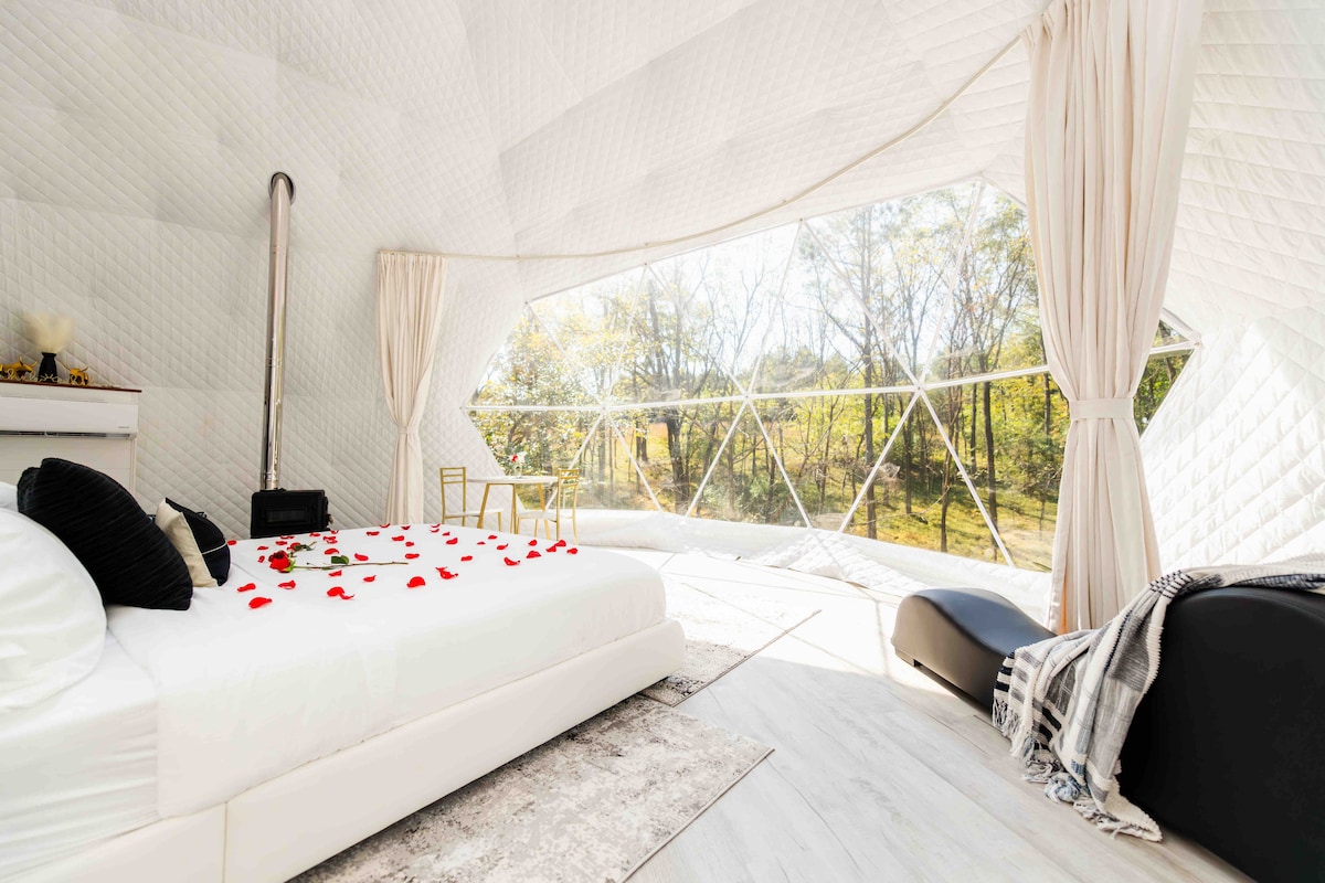 This geodesic dome is more than a place to stay; it's an invitation to a world of intimacy and enchantment. It's designed exclusively for couples seeking a secluded and meaningful escape. Whether you're celebrating a special occasion or simply craving quality time together, our dome is the perfect setting. Has all you need King size bed, A/C, heating, luxurious bath, modern kitchenette, private outdoor space, hot tub, fire pit and grill all yours for an unforgettable ESCAPE!