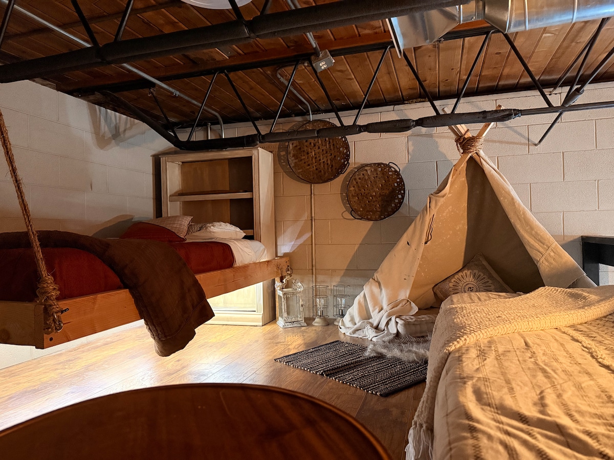 Zen Loft — a former yoga studio next door to a private spa with yoga, infrared sauna, & self care services.Perfect girls’ get away, couple's connection, wellness retreat and or spa staycation. • 14’ ceilings • Oversized French windows • Large open living space • Floating daybed • Aerial silk hammocks • 3 dedicated work spaces • Outdoor lounge, bistro lighting & fire pit • Curated accommodations for 8 • Central location Modern industrial meets peace & calm for this intimately expansive stay.