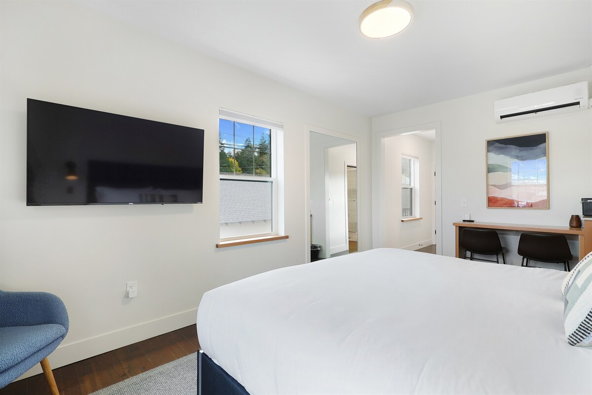Black Butte Mountain + downtown views from your windows! Your own private boutique hotel room nestled in downtown Mt Shasta. Our unique location allows you to walk to nearly everything and experience life in this incredible California mountain town. The entire property was professionally renovated in 2022 with an all new bathroom with walk-in tile shower, fast & reliable fiber internet, large screen smart tv and completely new furnishings throughout.