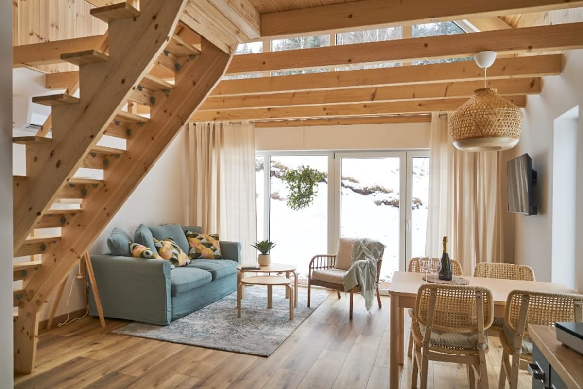 Một ngôi nhà nghỉ thôn dã đầy phong cách với tầm nhìn ra núi, nằm gần khu rừng dưới chân dãy núi Owl. Hoàn hảo cho các cặp đôi, gia đình và bất kỳ ai tìm kiếm sự yên bình và kết nối với thiên nhiên. Nội thất ấm cúng: phòng ngủ, phòng khách với giường sofa, nhà bếp, phòng tắm, Wi-Fi, TV. Khu vườn đẹp, tiệc nướng, lò sưởi, ghế tắm nắng, võng. Gần đường mòn đi bộ đường dài, điểm tham quan và rừng cây. Thân thiện với dị ứng. Chất lượng cao, sạch sẽ và vị trí tuyệt vời – đặt ngay và thư giãn theo nhịp điệu của thiên nhiên!