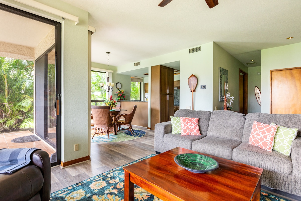 Discover the calm of The Olena, a contemporary 1-bedroom ground floor apartment with A/C, nestled in a quiet complex at the heart of Keauhou in Kailua-Kona. Designed with natural accents and thoughtful details, it is an ideal getaway for 4 guests to enjoy easy walking access to Keauhou Bay and the shops at Keauhou Shopping Center. Enjoy a shared pool, savor sunsets on the expansive lanai with a picturesque view of the Kona Country Club, and immerse yourself in the laid back lifestyle of Hawaii.