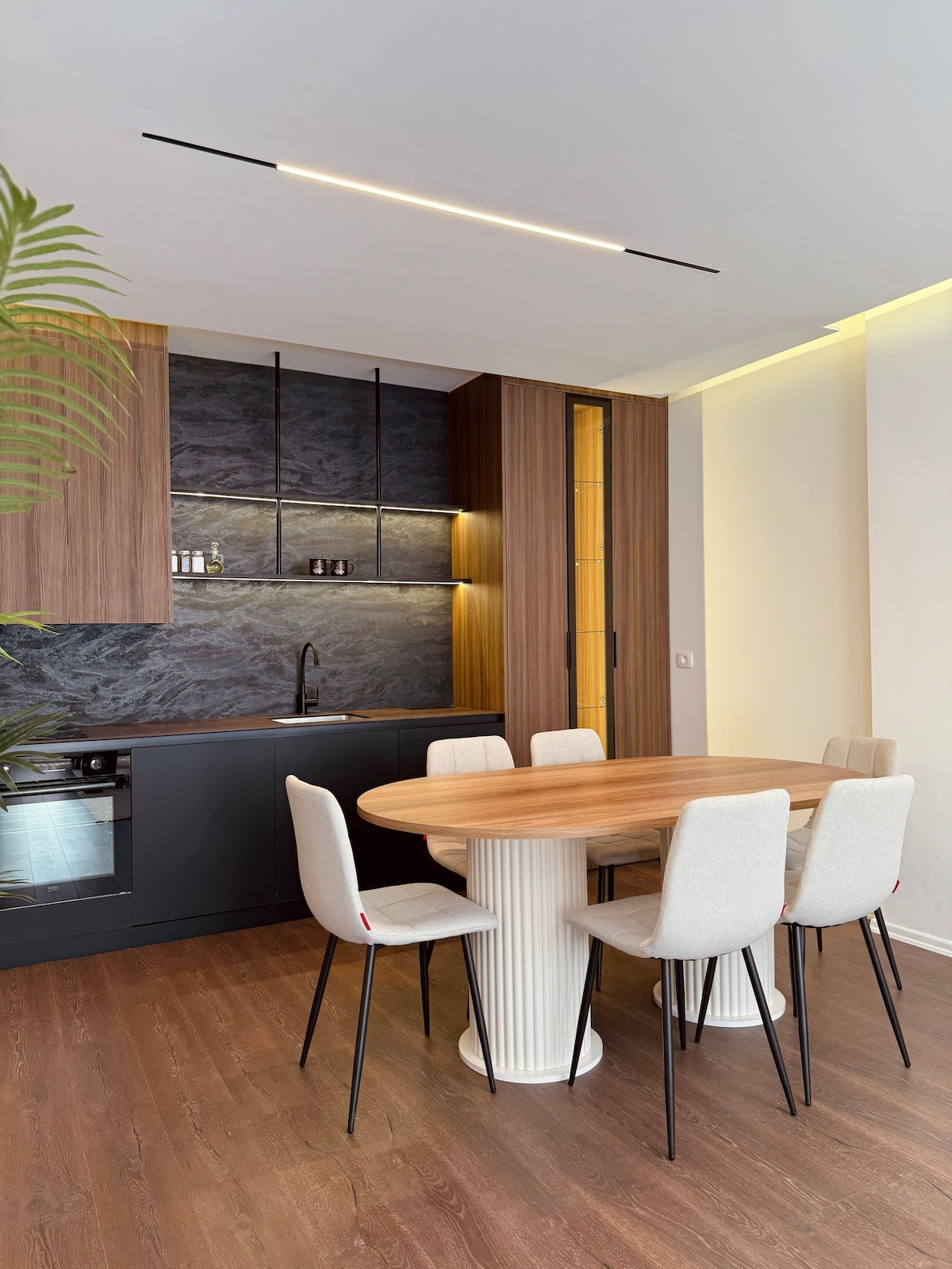 Located in the very heart of Prishtina, directly in the main city square, this apartment sits in a fully walkable, pedestrian-only area with no car traffic. Cafés, restaurants, bookstores, and cultural spots are all just steps away. As expected for such a central and vibrant location, the surroundings are lively, especially during the day and evening. The apartment features a smartly designed kitchen that can transform into a living area, with deep, rich tones creating a warm urban atmosphere.