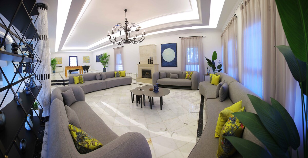 Escape to The Blue Villa ở Koura, North Lebanon - chỉ cách Tripoli 15 phút! Biệt thự rộng rãi này có sức chứa từ 17 người trở lên và có 5 phòng ngủ, 6 phòng tắm, hồ bơi riêng, bể sục, bi-a, bóng ném, vườn lớn, BBQ, v.v. Tận hưởng nhà bếp được trang bị đầy đủ tiện nghi, ăn uống trong nhà/ngoài trời, điện 24/7, WiFi và hệ thống an ninh. Thú cưng được chào đón (không phải trên đồ nội thất), cho phép mở nhạc lớn cho đến nửa đêm. Hoàn hảo cho nhóm, gia đình và kỳ nghỉ cuối tuần!